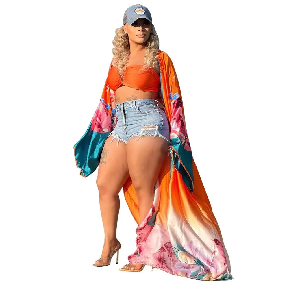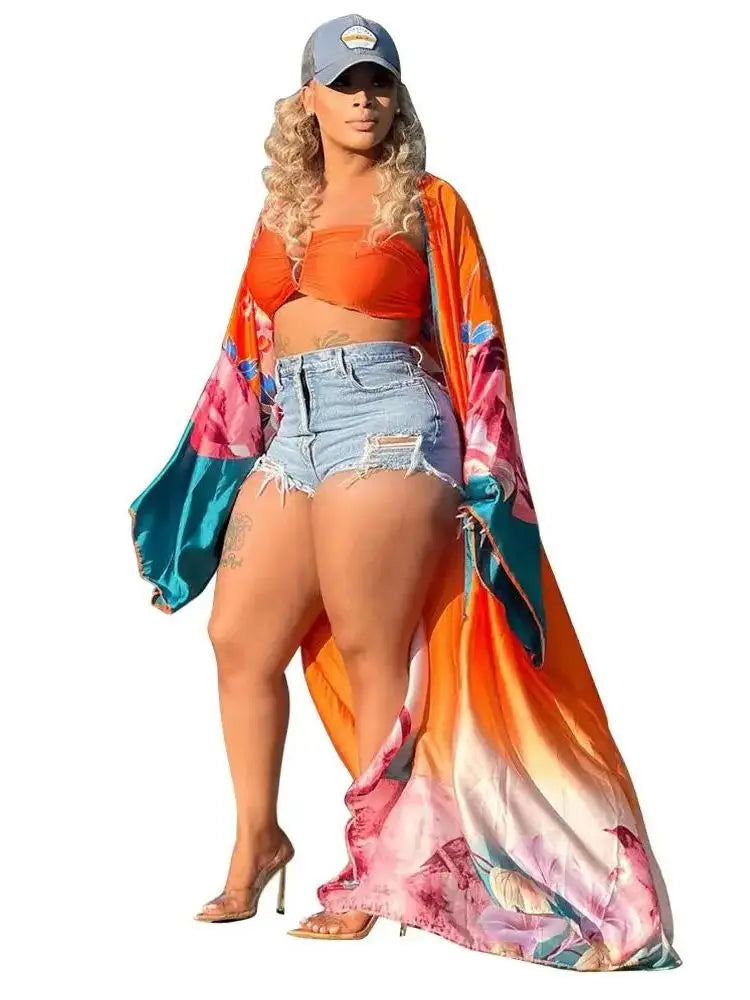 1359Women's cross-border explosive outerwear random print fashion casual trench coat