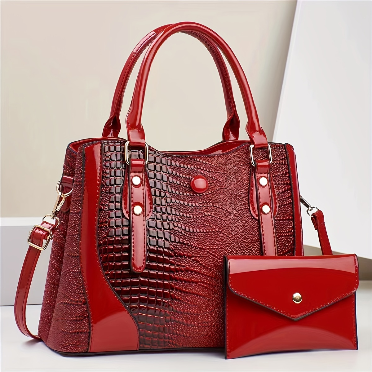 2-Piece Set Crocodile-Embossed PU Leather Handbags, Large Capacity Retro Style Bag, Fashionable Tote & Crossbody Bag For Women With Shoulder Strap