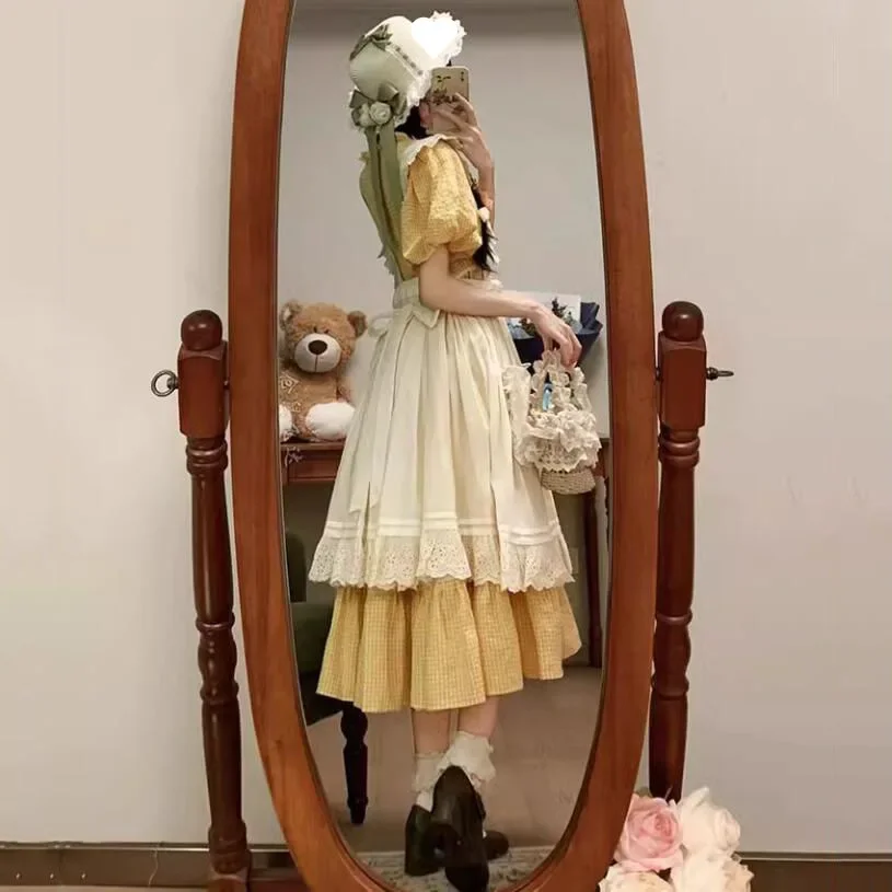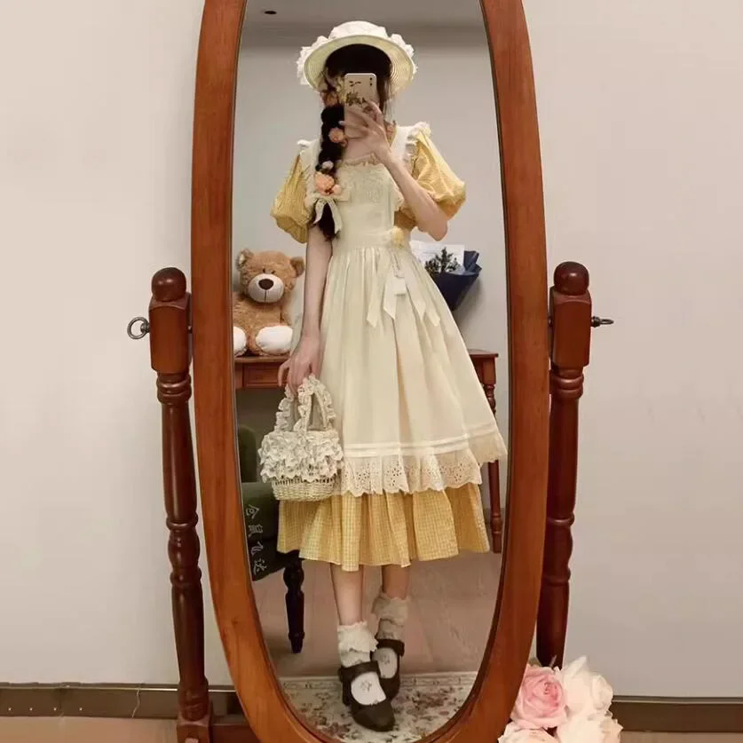 2025Spring NEW Two-piece Dress Suit French Sweet Pastoral Style Slim Square Collar Yellow Plaid Dress Women + Ruffles OuterDress