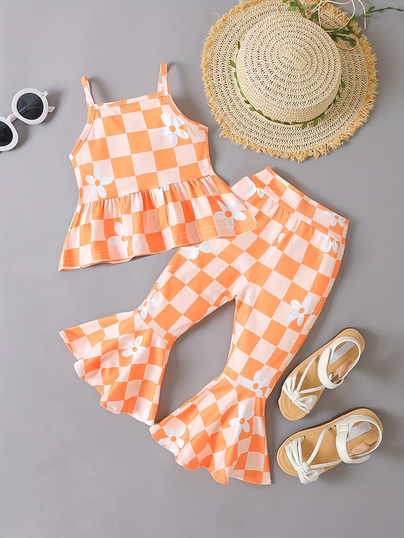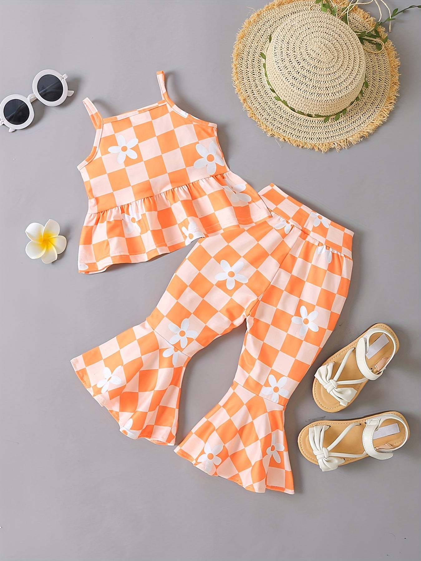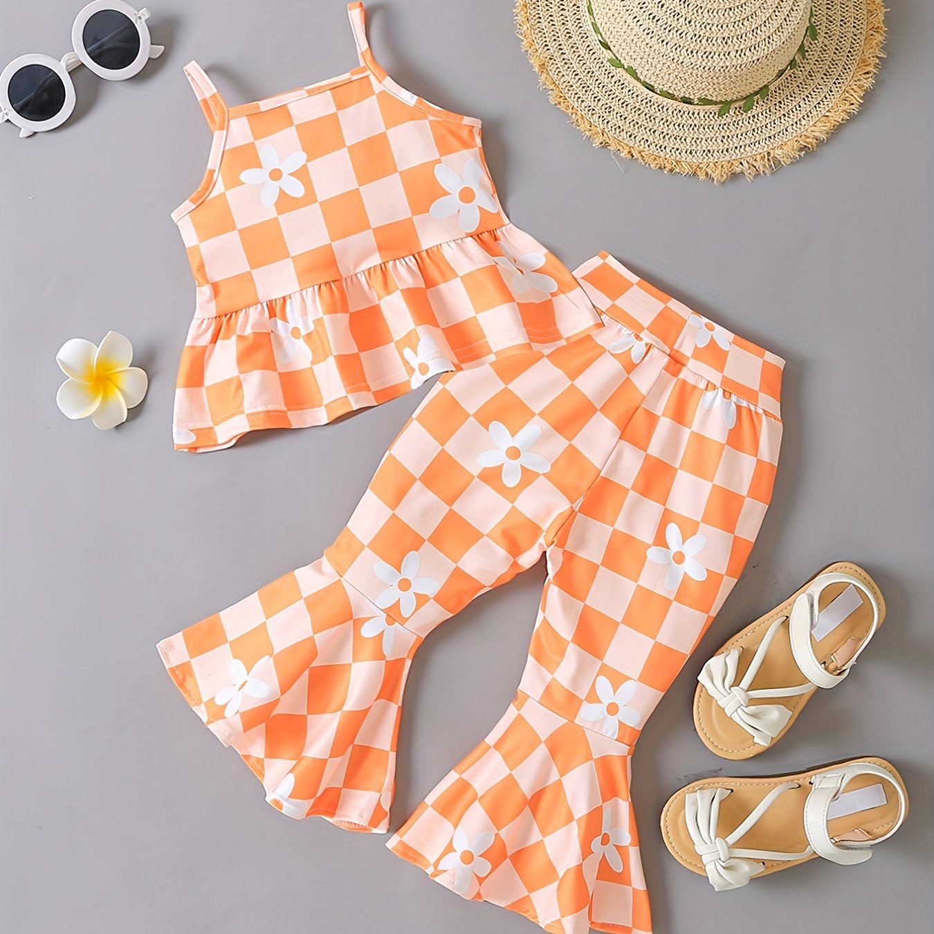 2pcs Adorable Baby Girls Floral Plaid Cami Tops & Flare Pants Set - Soft Medium Stretch Fabric, Ruffle Details, Sleeveless, Casual Style - Perfect for Spring/Summer Season