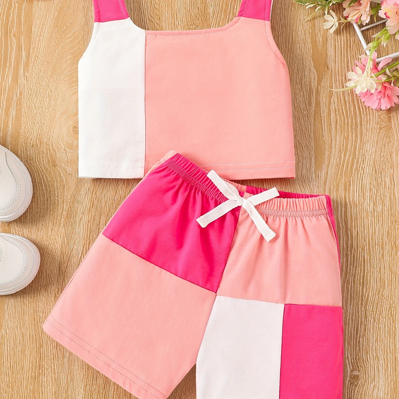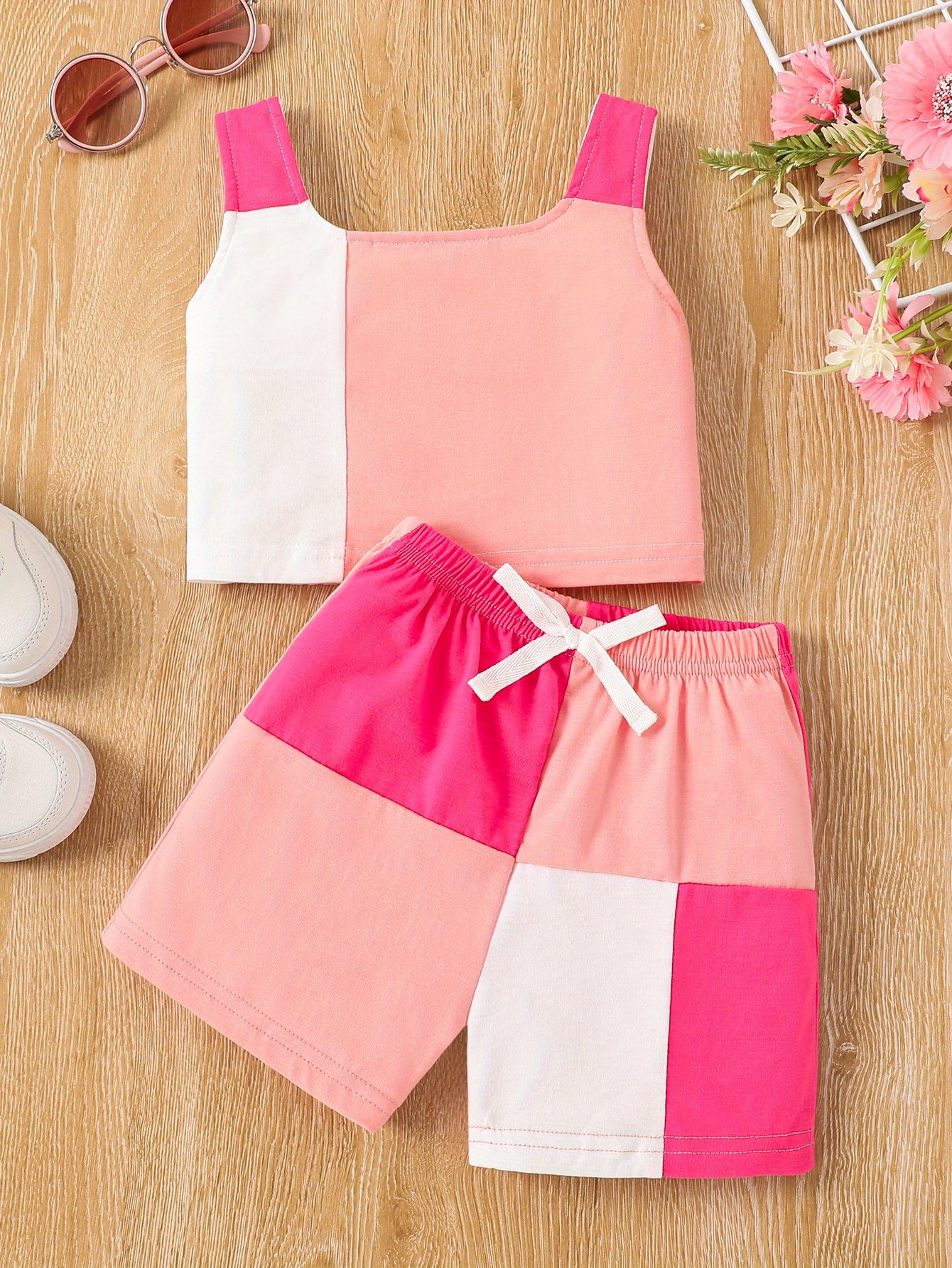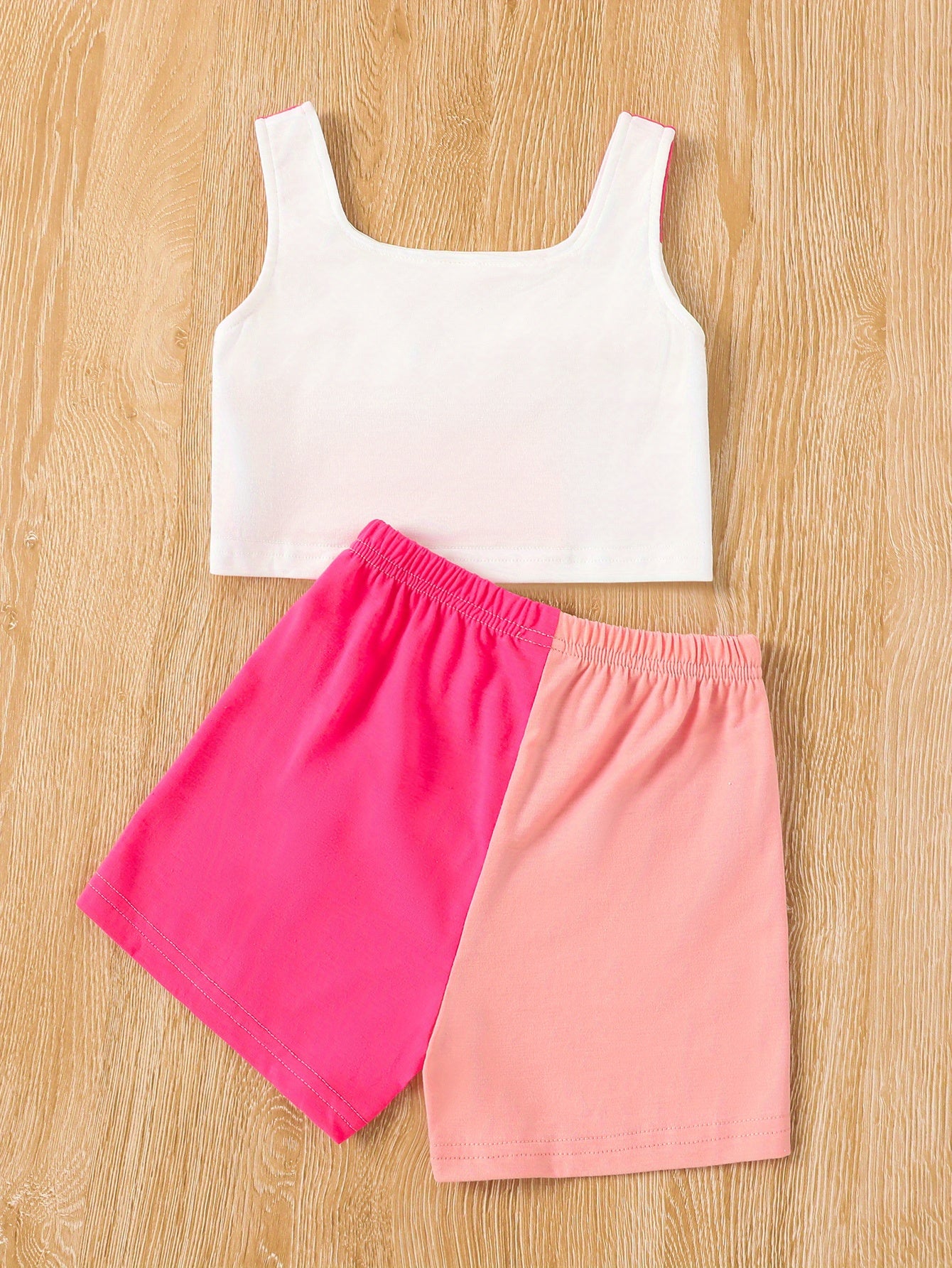 2pcs Toddler Girls Color Block Cami Tops & Bow Elastic Waist Plaid Shorts Set Kids Summer Clothes