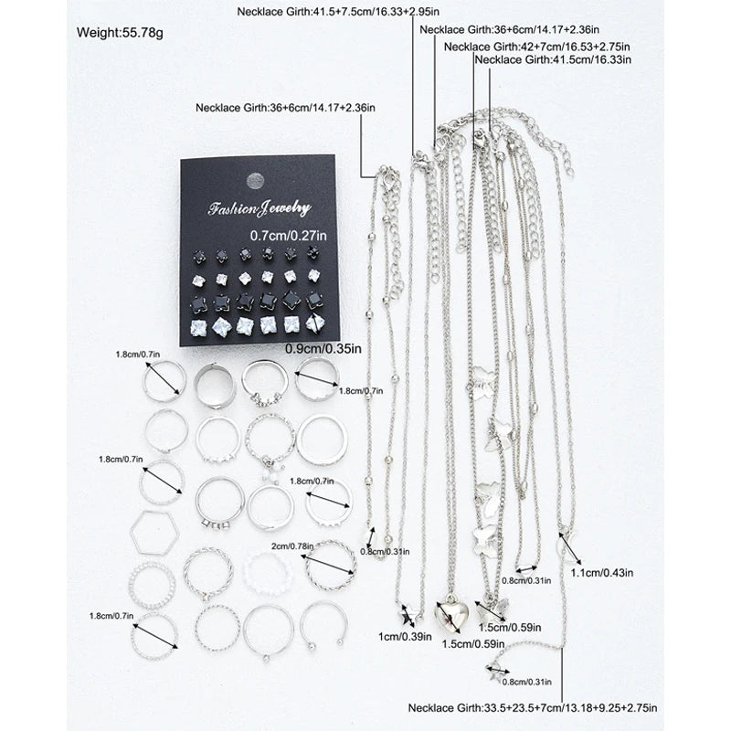 51 Pcs/Set Silver Color Chic Jewelry Set For Women Fashion Butterfly Heart Pearl Necklaces, Earrings, Rings, Match Daily Outfits