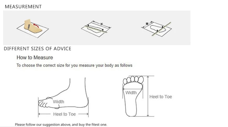 -- Please measure your foot length carefully and choose the right size according to your foot length. if your foot is wider or fat ,please choose one size larger. if your foot is slim or narrow, please choose one size smaller. Any questions pls feel free to contact us. We are always here and willing to service you