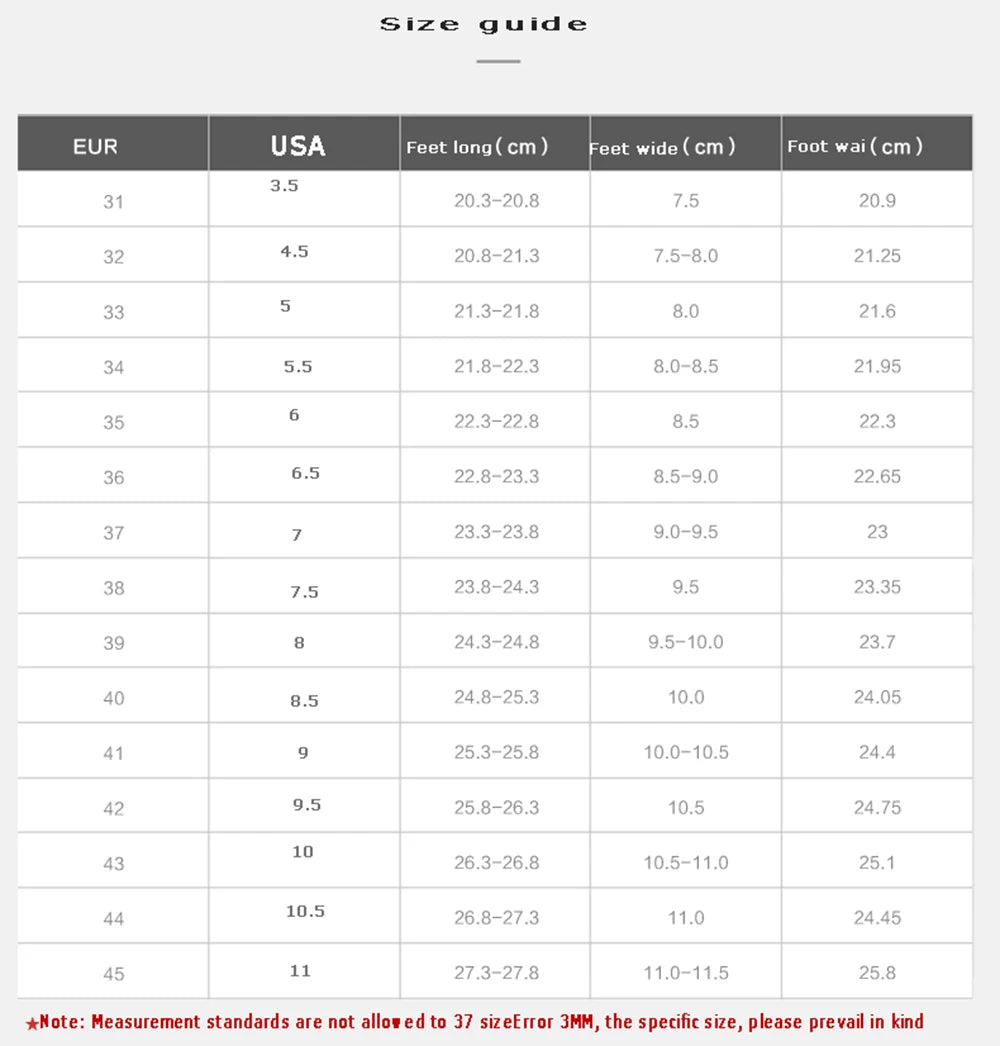 To avoid delaying your package time, please measure your foot length before purchasing shoes and choose the correct size according to our size chart. To prevent buyers from delaying the use of shoes, as centimeter length is an internationally recognized unit, they will not purchase the wrong size.