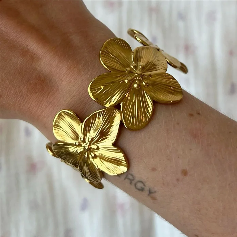 Bohemian Flower Bangles For Women Stainless Steel Wide Bracelet Chunky Flora Cuff Bangle Couple Jewelry Valentine's Day Gifts
