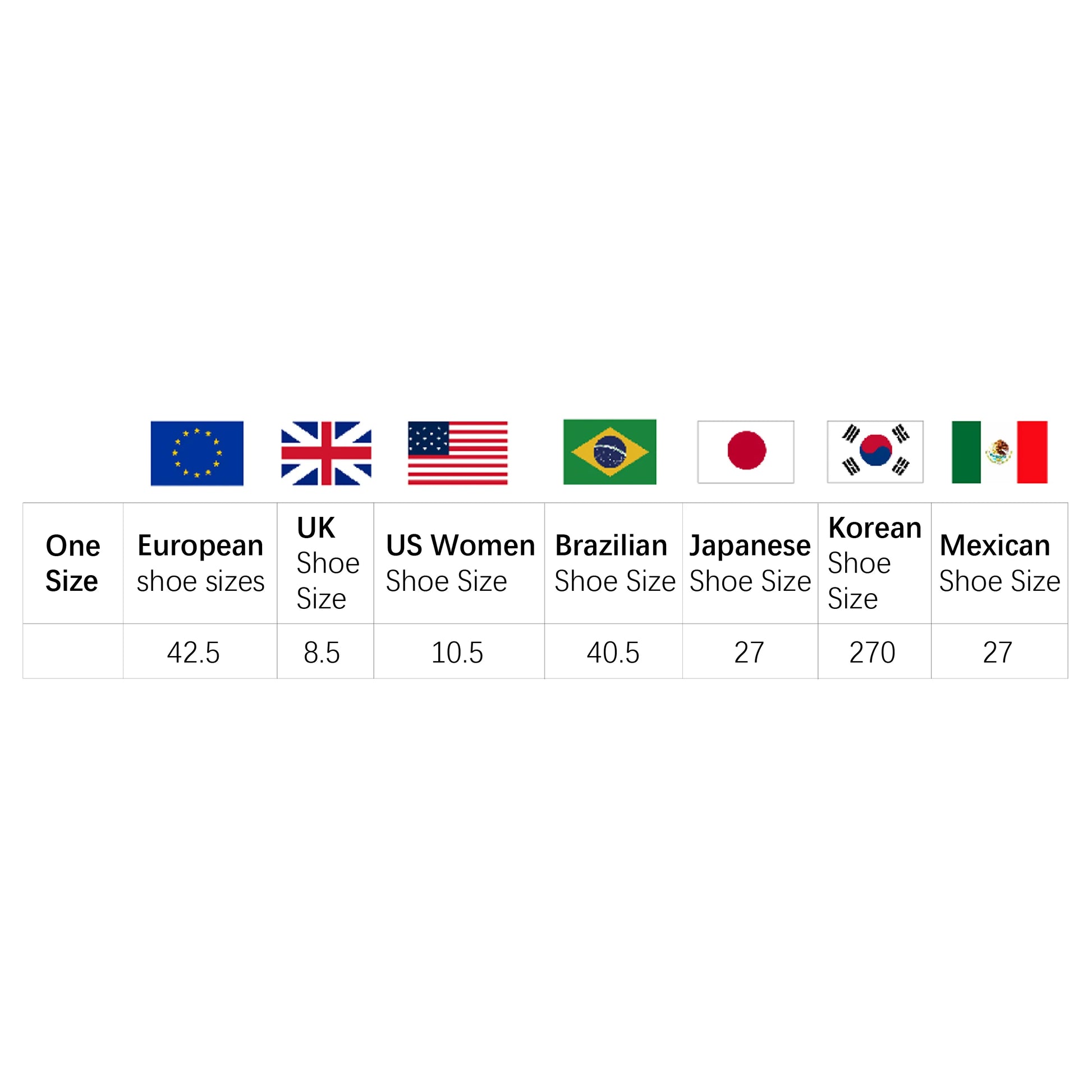 size_info: {"sizeInfoList":[{"countrySizeMap":{"EU":"42","BR":"40.5","JP":"26.5","UK":"7","KR":"270","MX":"27","US":"9"},"length":{"cm":"27","inch":"10.63"},"size":"One Size","vid":200001058}]}