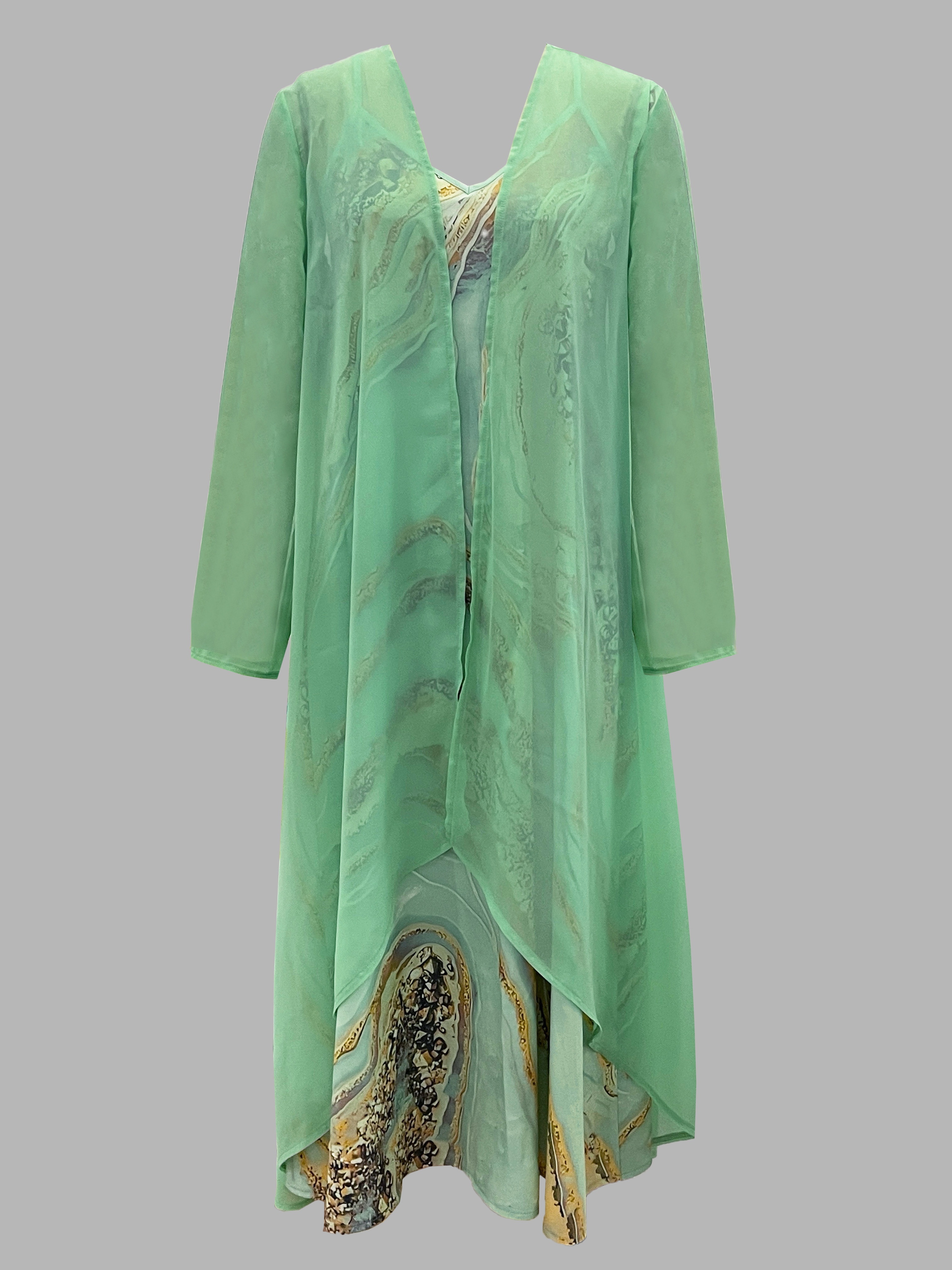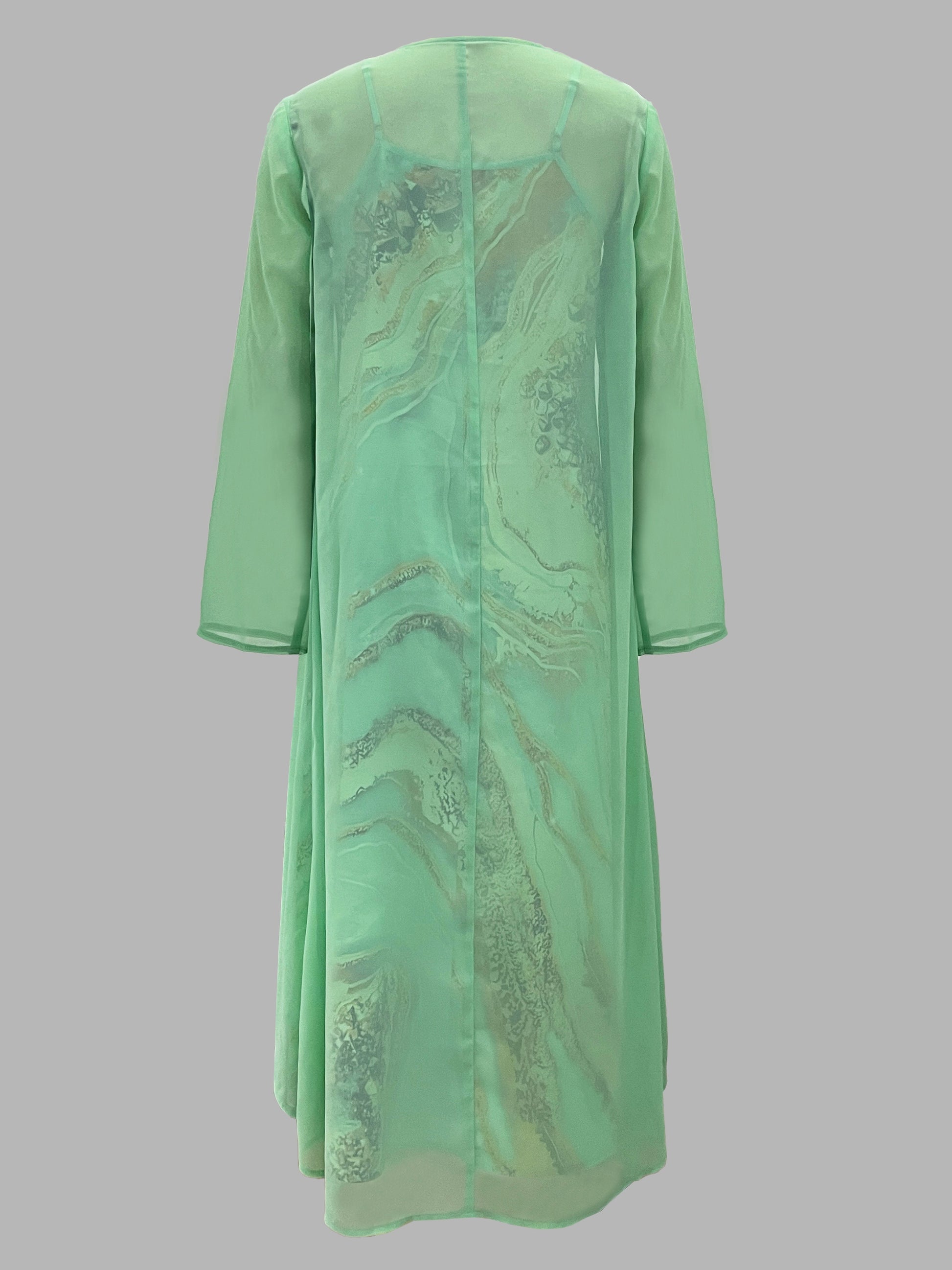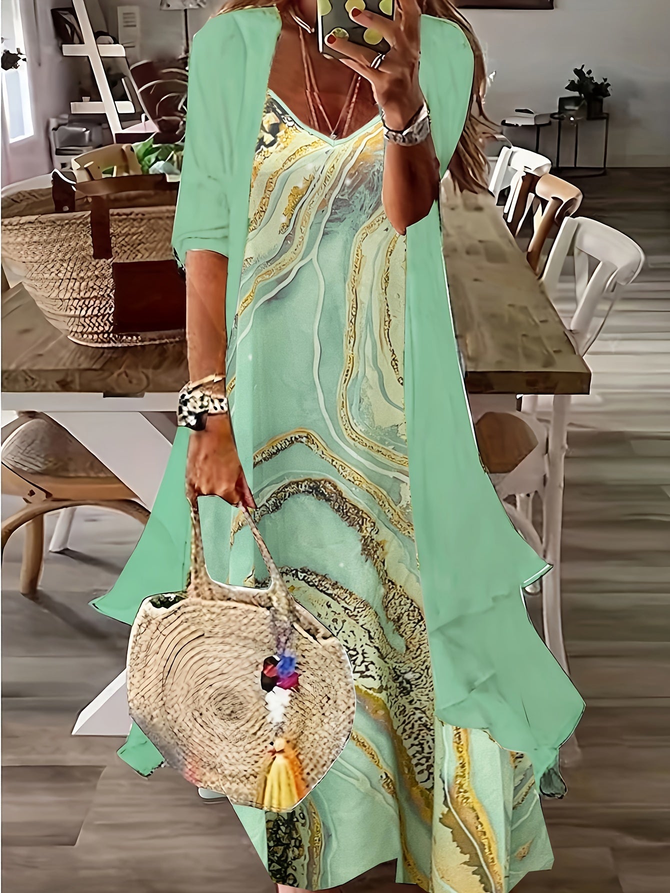 Chic Two-Piece Dress Set - Elegant Loose Fit with Solid Long Sleeve Coat & Marble-Printed Sleeveless Spaghetti Strap Dress, Perfect for Versatile Style and Comfort