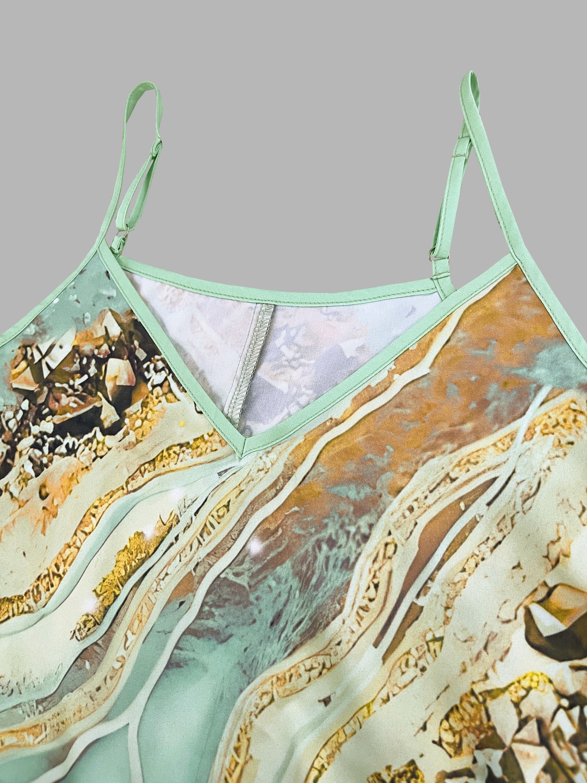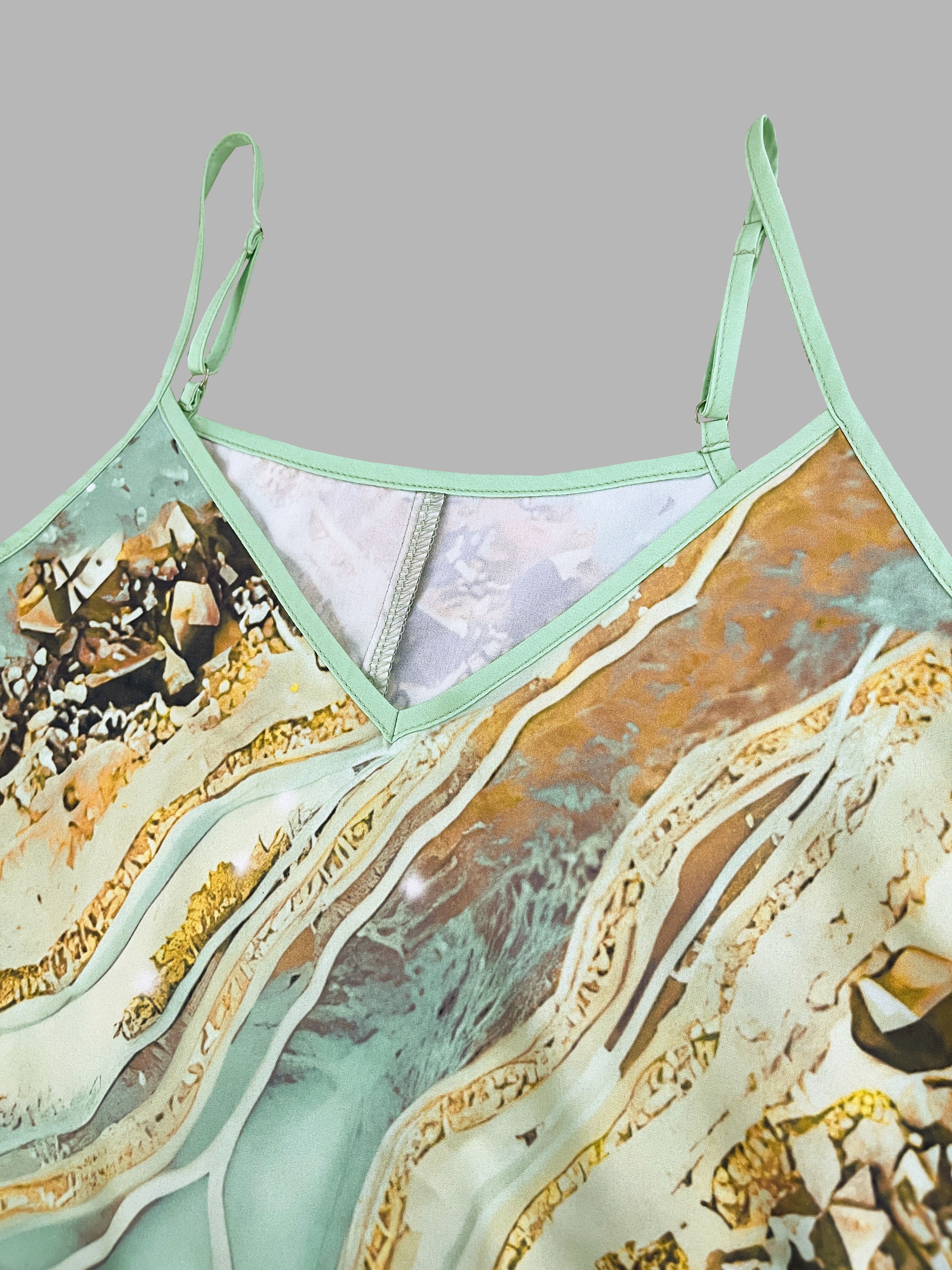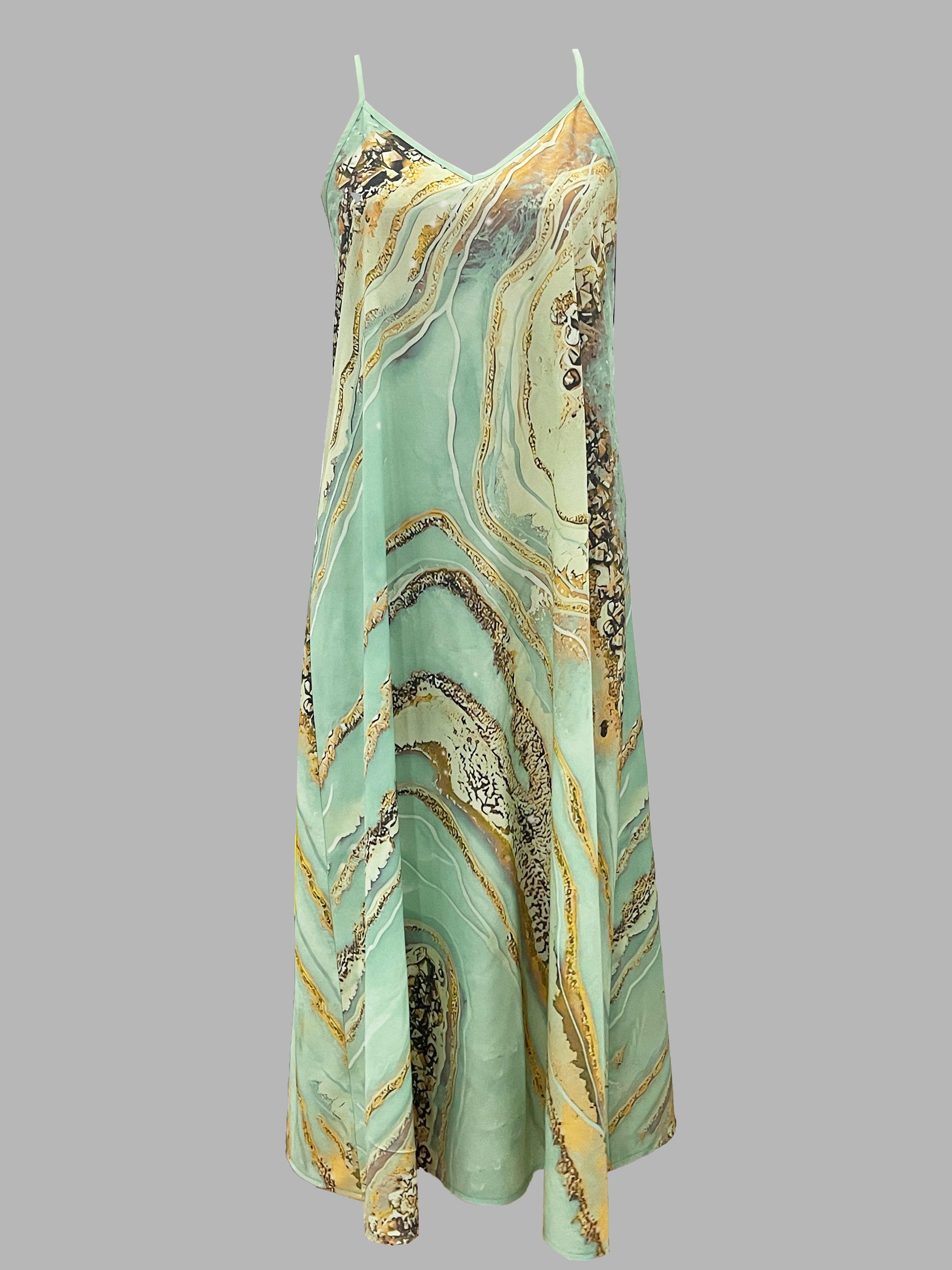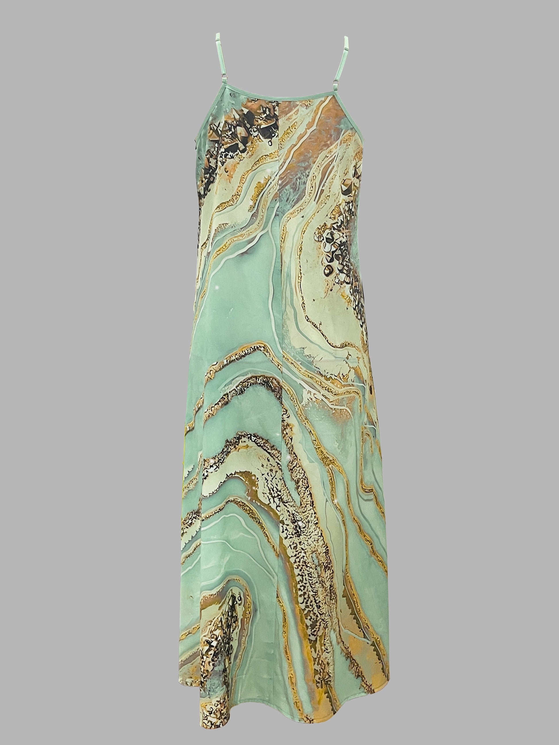 Chic Two-Piece Dress Set - Elegant Loose Fit with Solid Long Sleeve Coat & Marble-Printed Sleeveless Spaghetti Strap Dress, Perfect for Versatile Style and Comfort