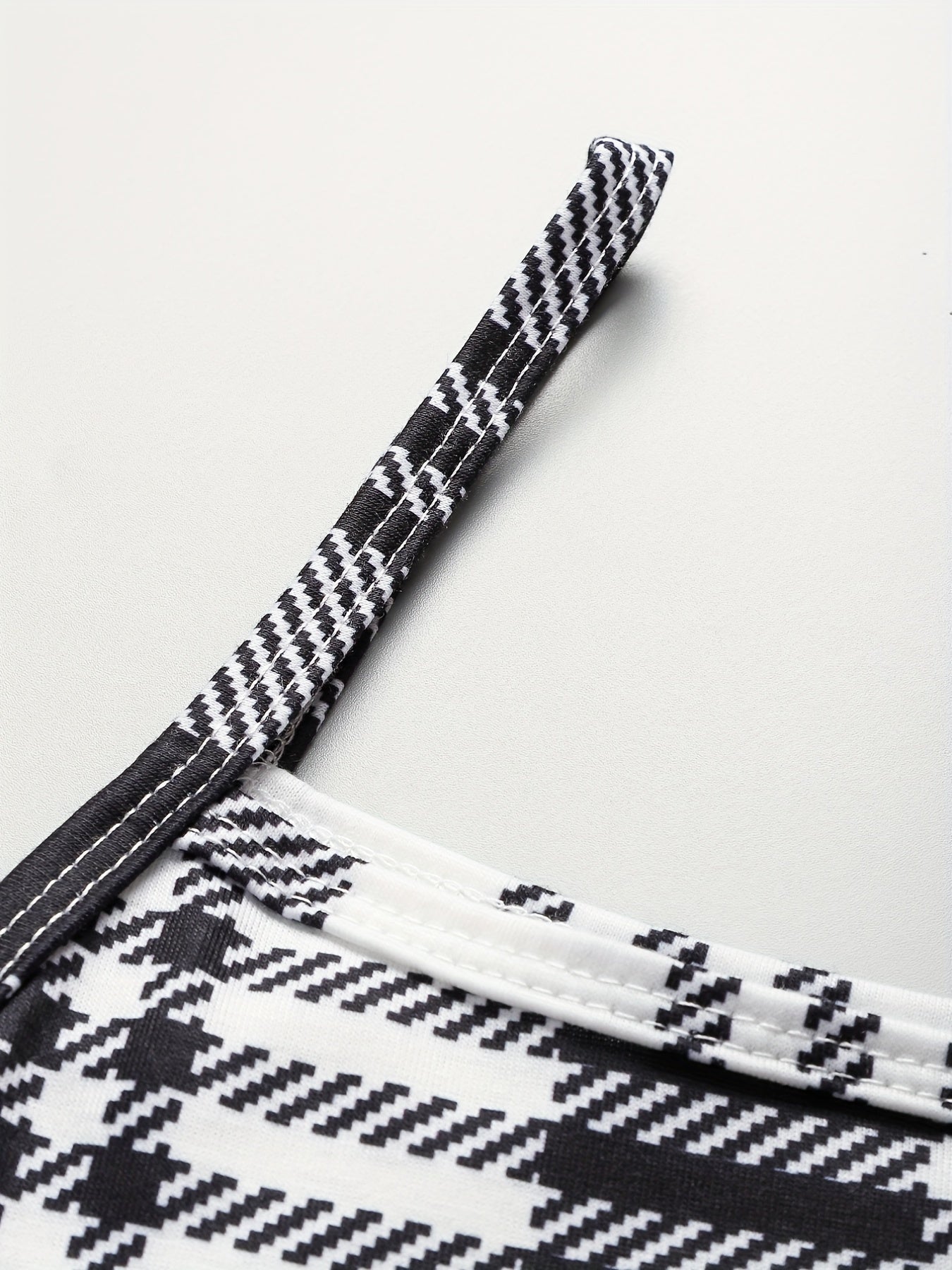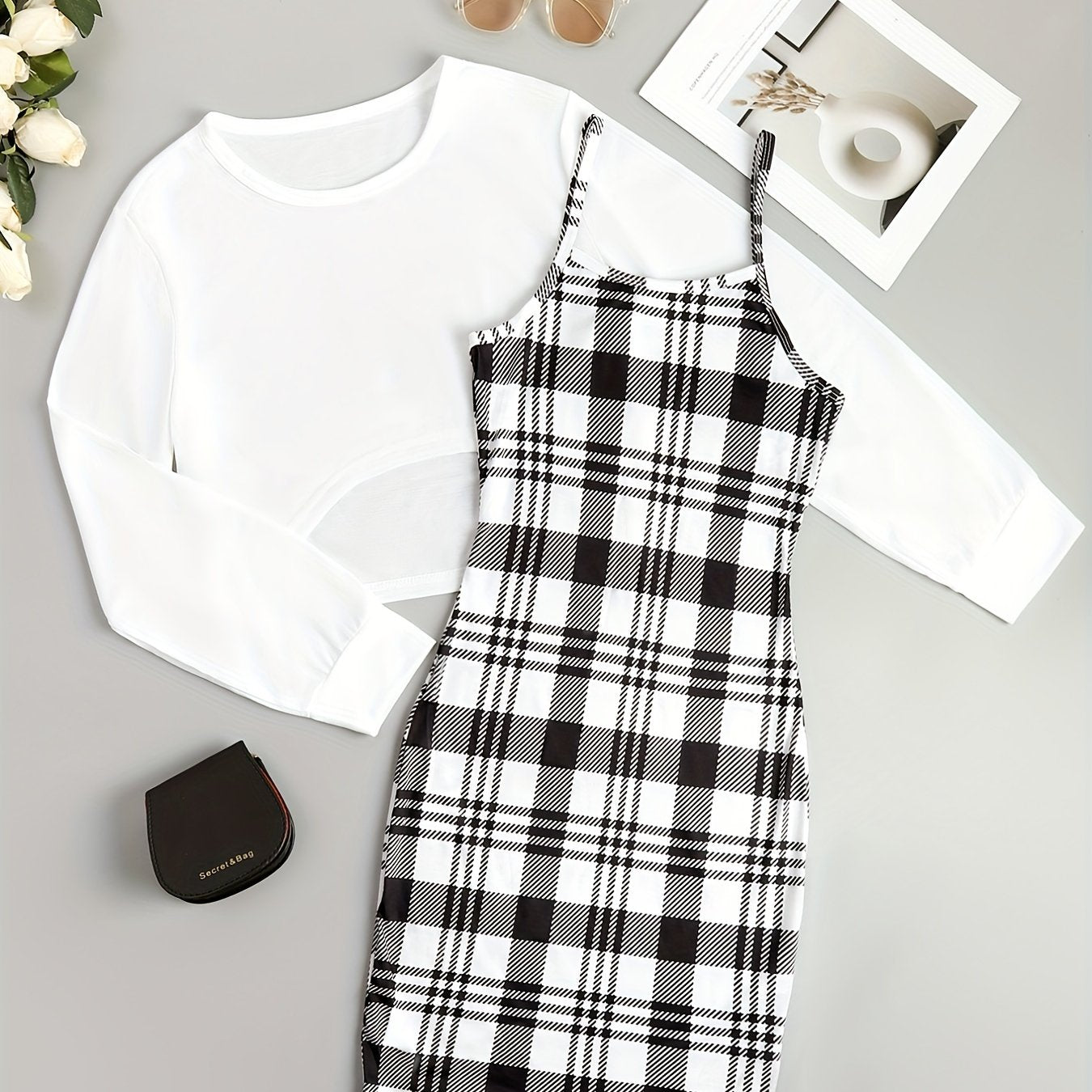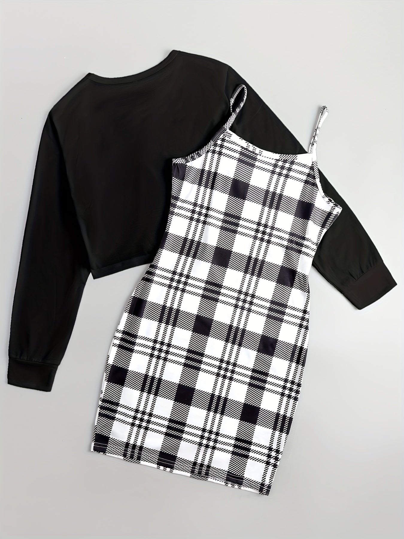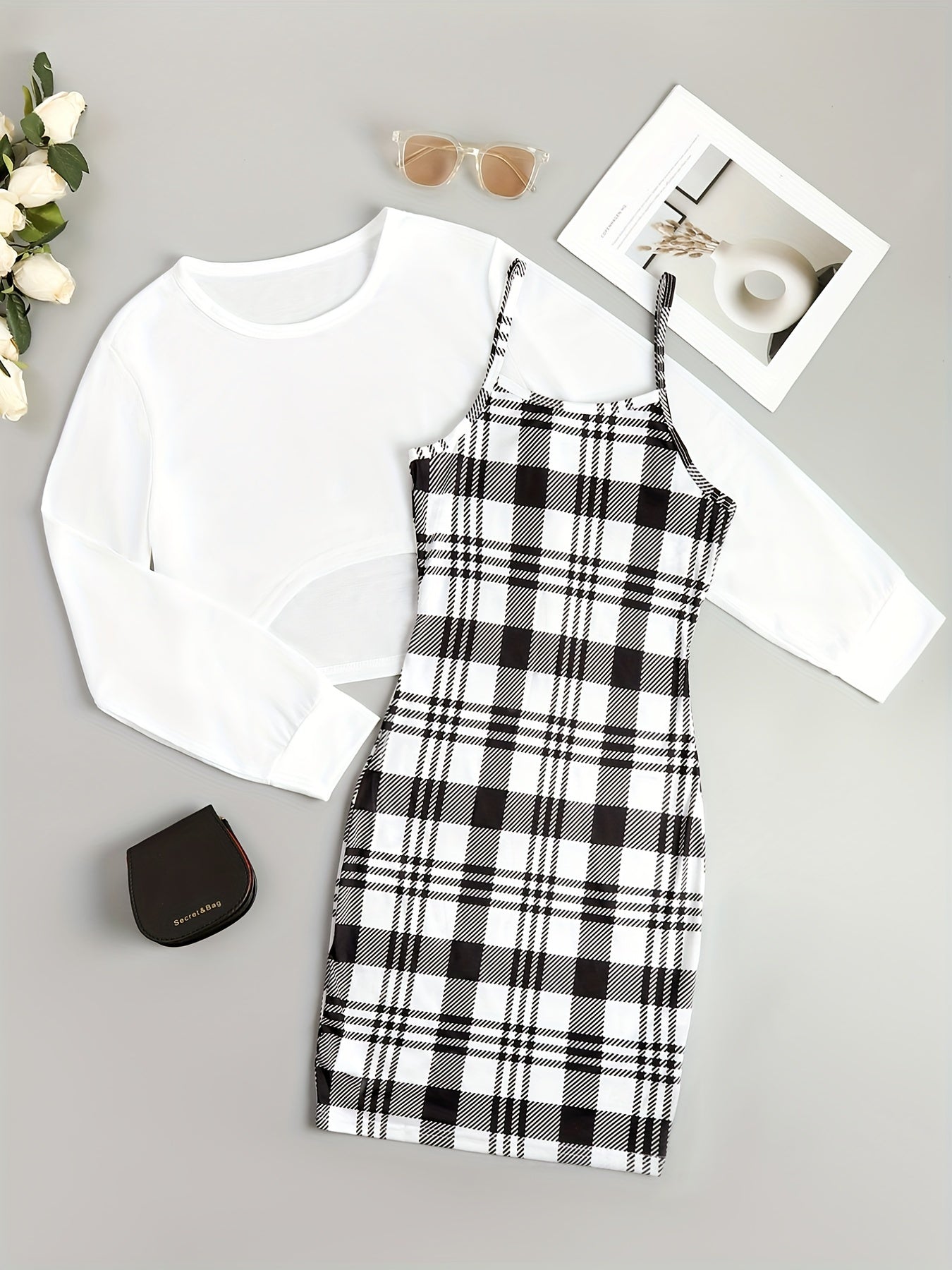 Chic Womens Two-Piece Dress Set - Fashionable Asymmetrical Hem Crop Top & Plaid Cami Dress Outfit - Flattering Long Sleeves, Versatile Casual Wear for Multiple Occasions - Premium Quality