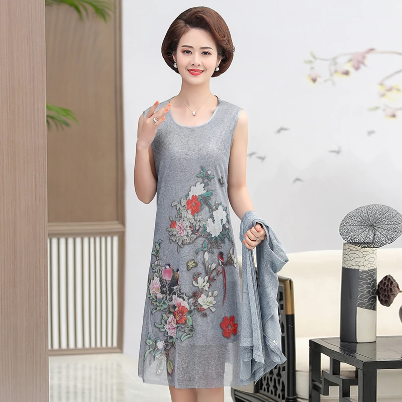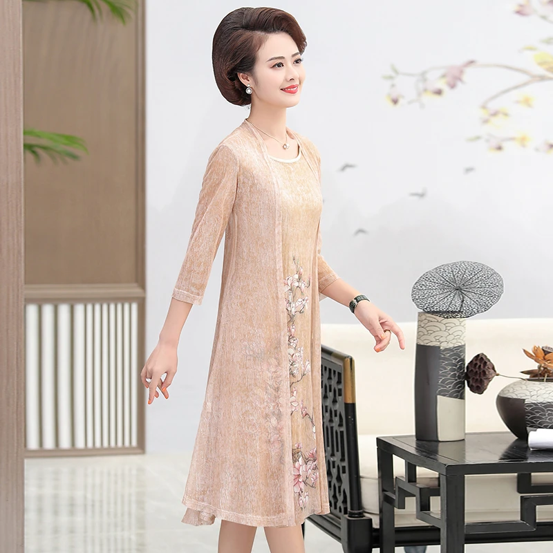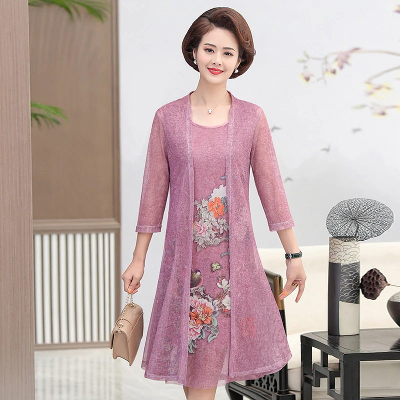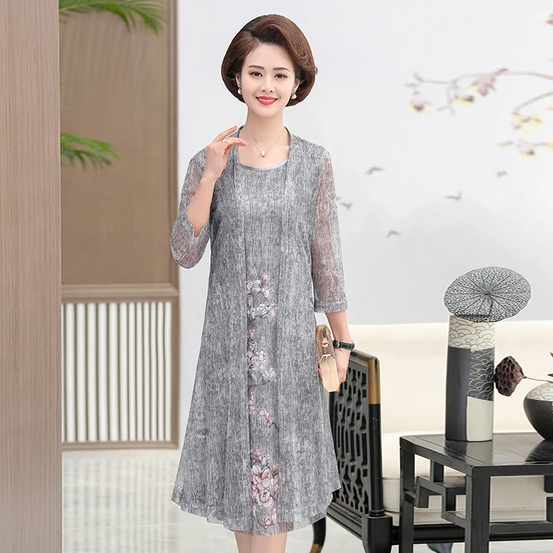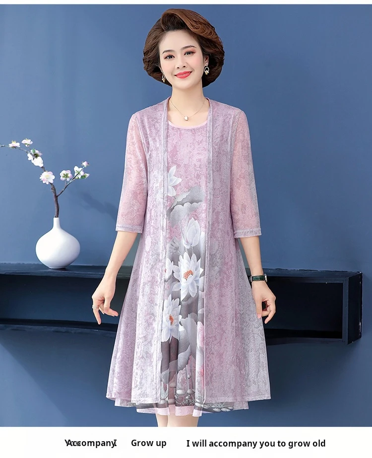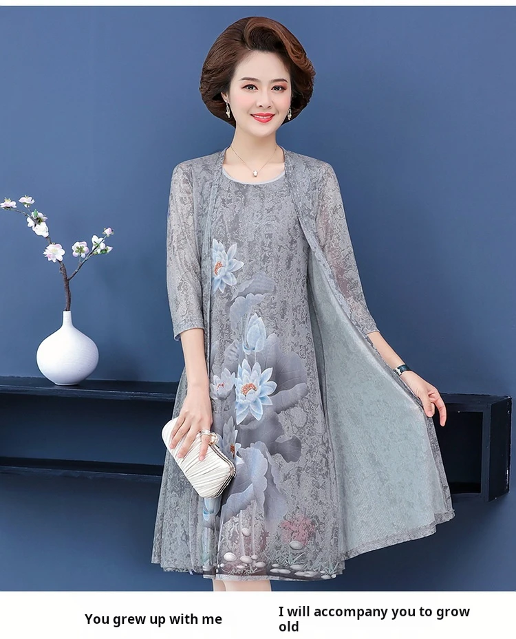 Elegant Dresses Women NEW Summer Casual Retro Temperament printing two Piece Set Dress Mother Dress plus Size