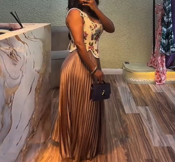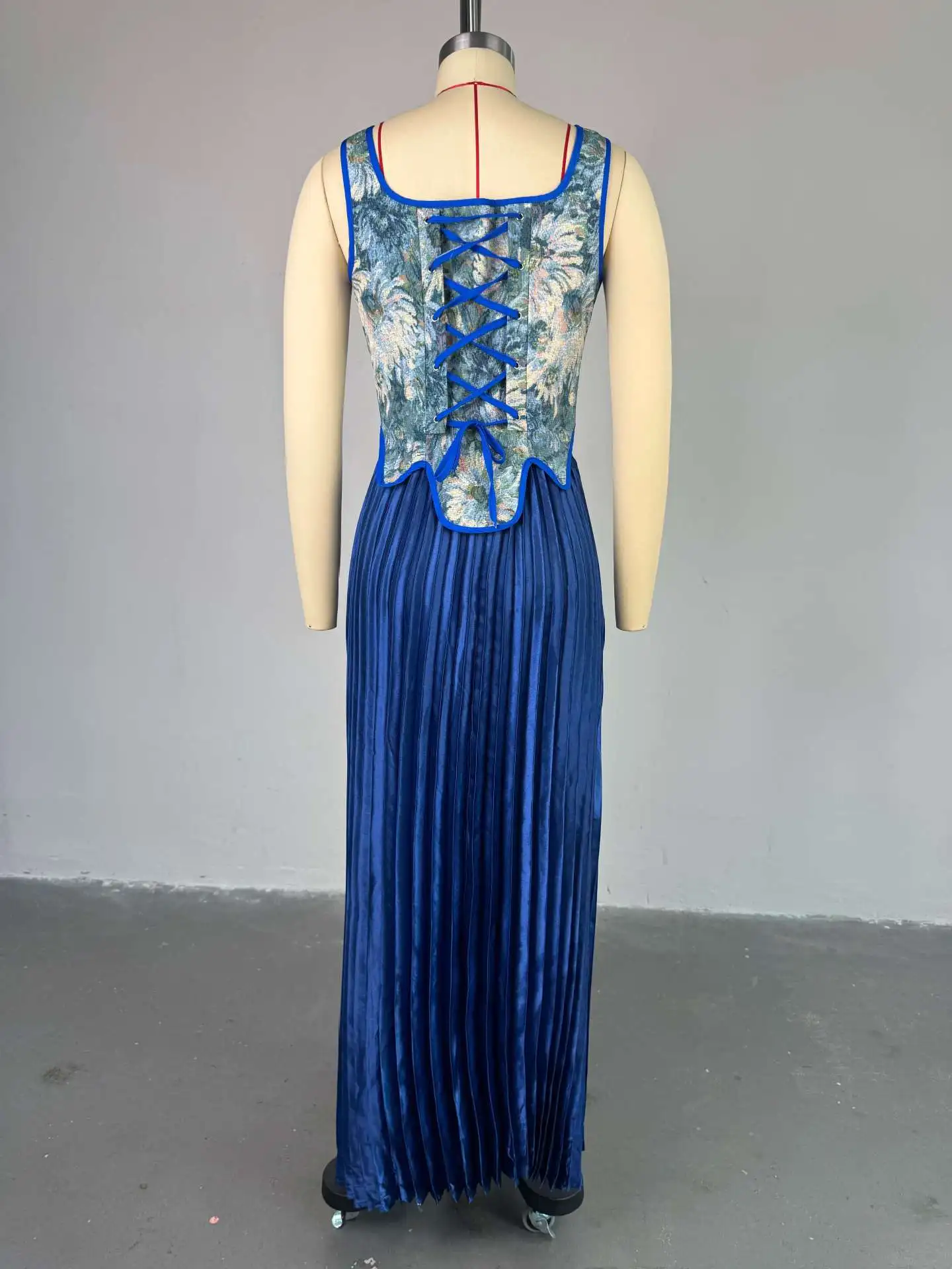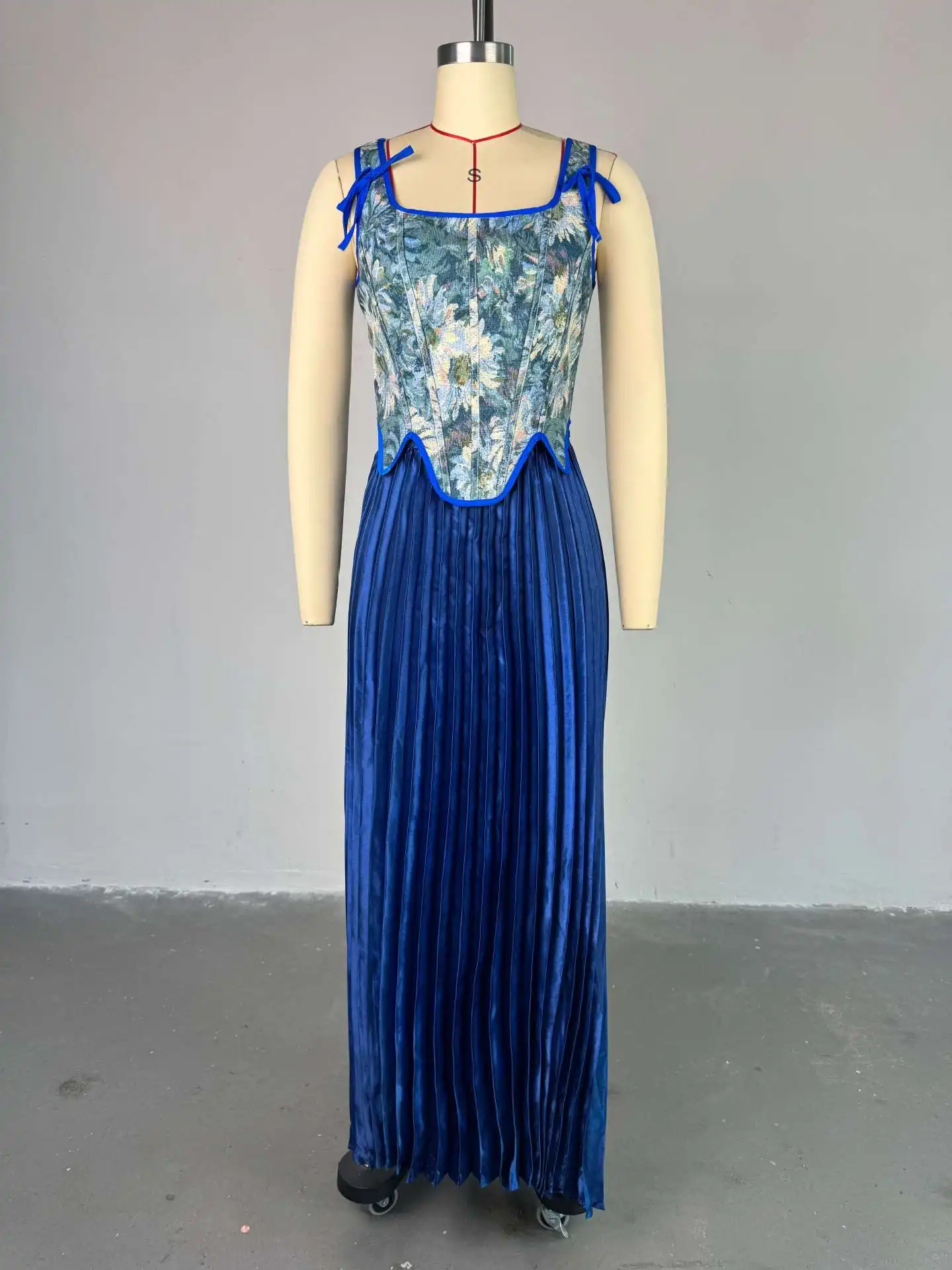 Elegant Party Dresses Woman Sexy New Sweet and Fresh Printed Waist Collection Tank Top High Waist Pleated Skirt Two Piece Set