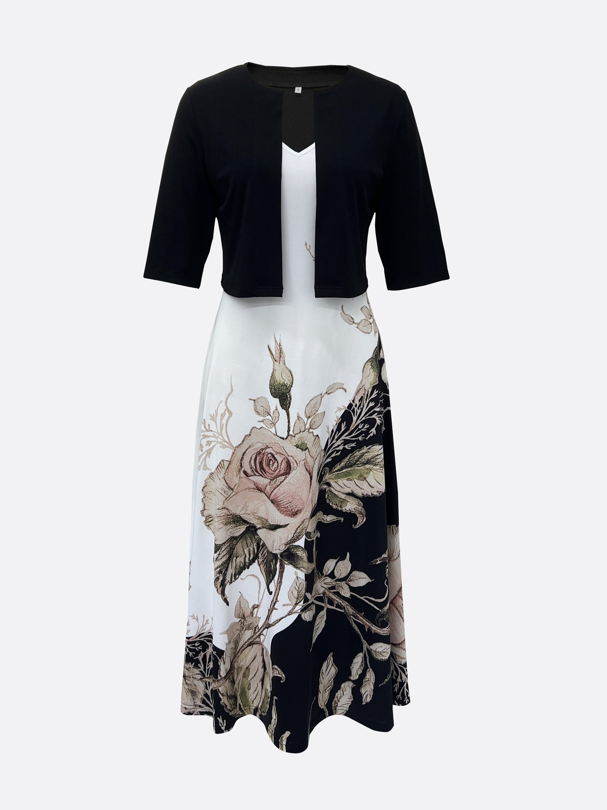 Elegant Two-piece Dress Set, Crop Half Sleeve Top & Floral Print Tank Dress Outfits, Women's Clothing
