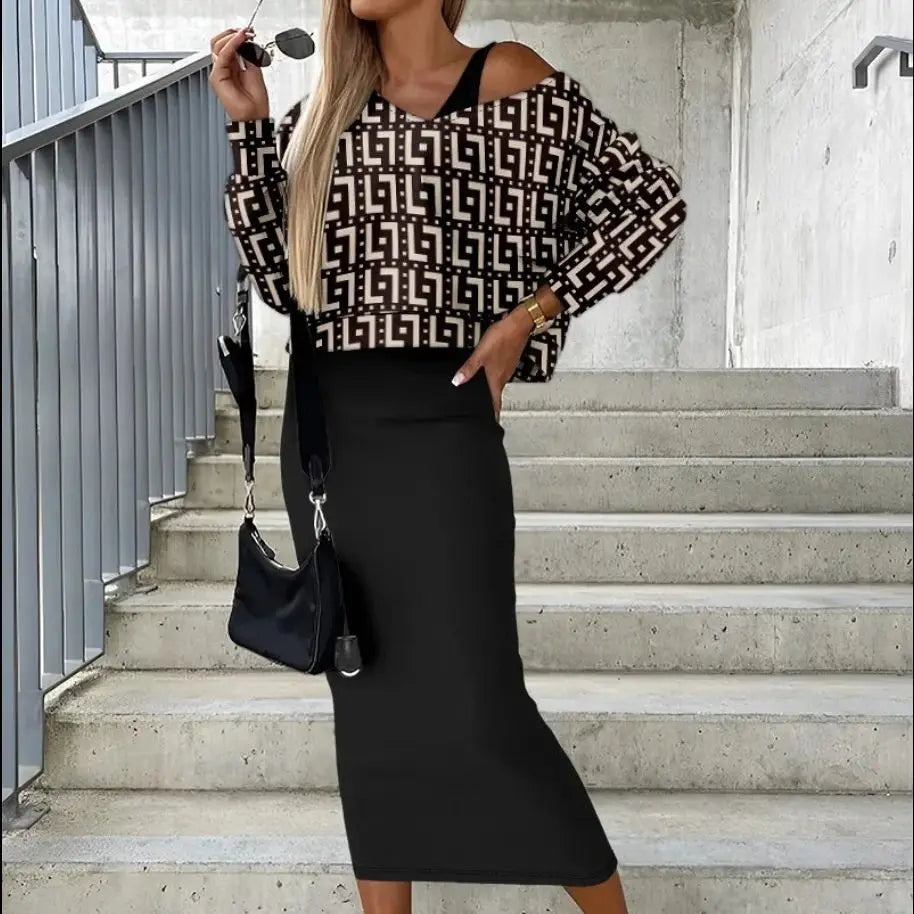 Fashion Print Two Piece Dress Women's Set Sexy Deep V-Neck Top & Bag Hip Long Dress Set 2023 Autumn Winter New Casual Outfit
