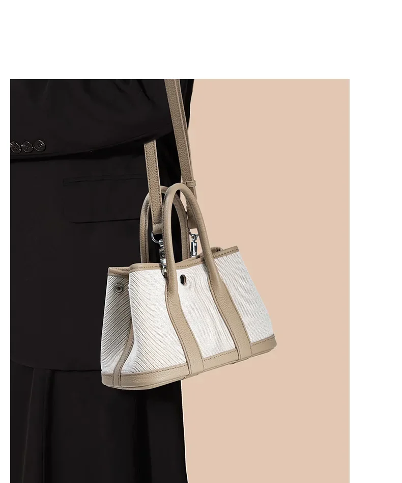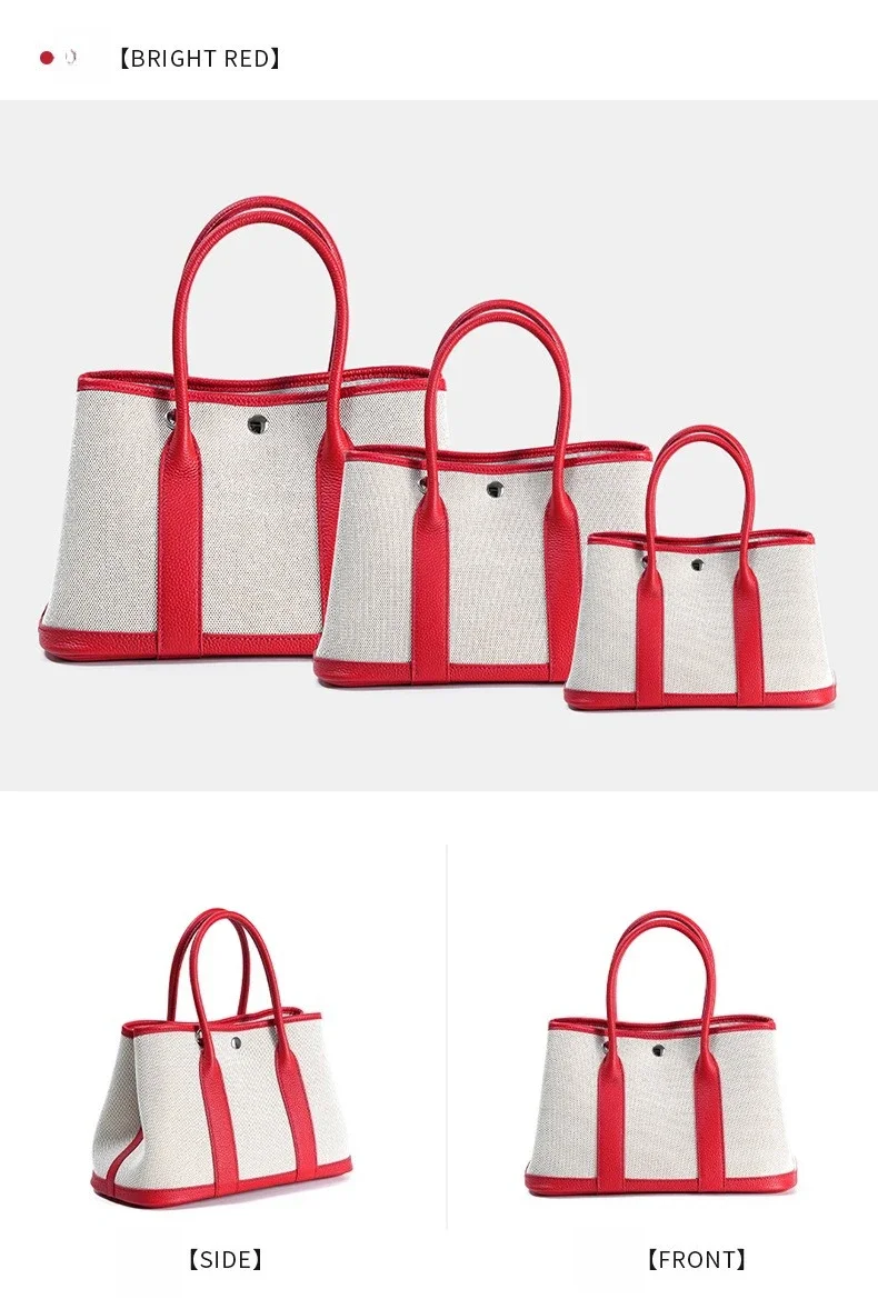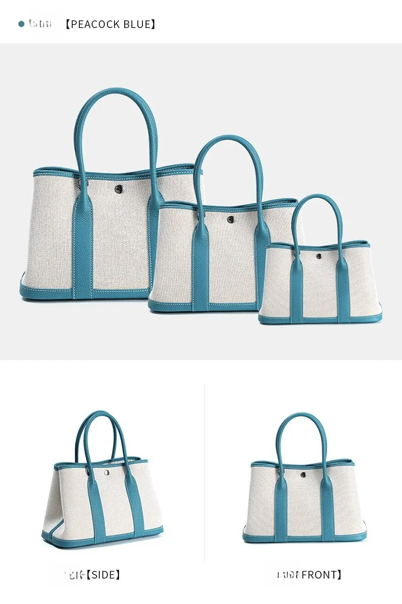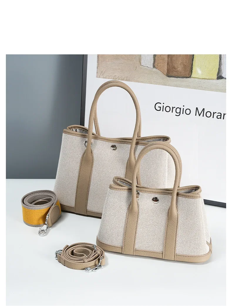 2024新款帆布配头层牛皮女包花园手提包大容量真皮撞色单肩托特包