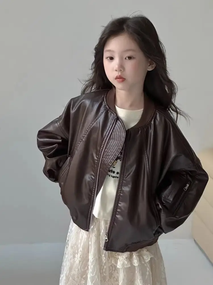 Girls' outerwear Spring and Autumn 2025 New Fashionable Outerwear Short Leather Jacket Autumn Clothing for Children