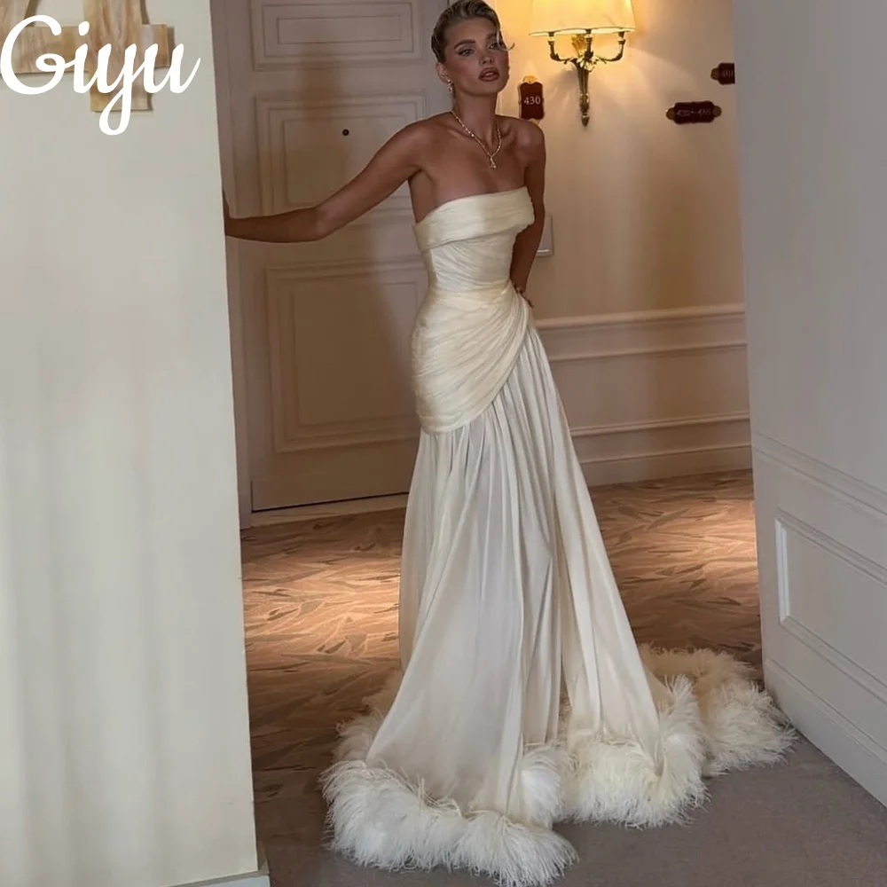 Giyu Elegant Cream Sleeveless Evening Gown Feather Satin A-line Pleat فساتين سهرة Customized Floor-Length Evening Gown
