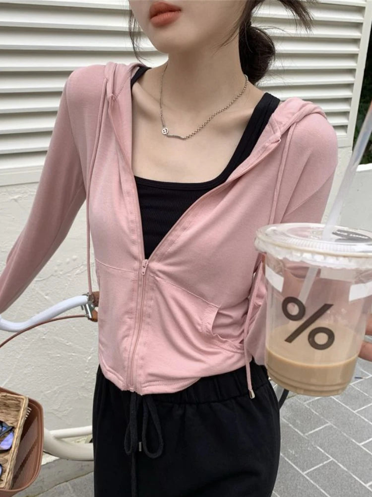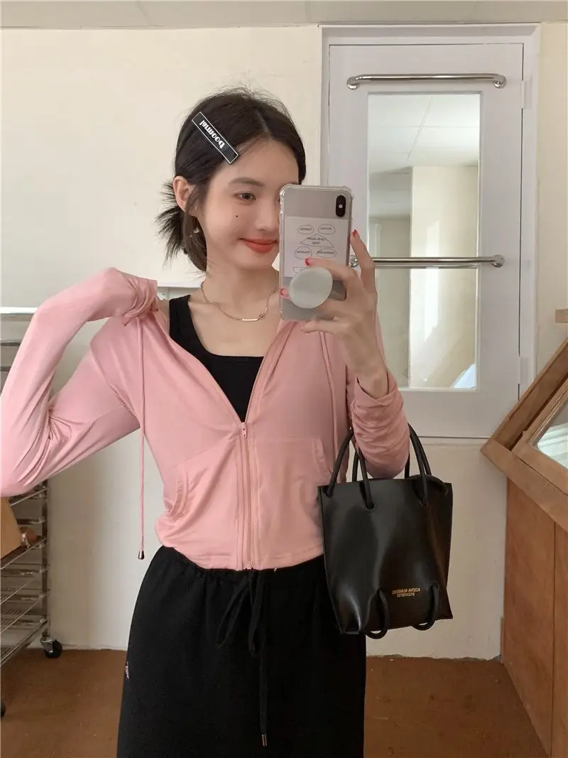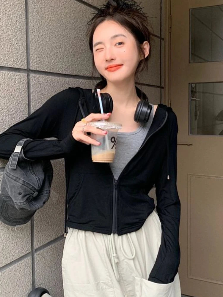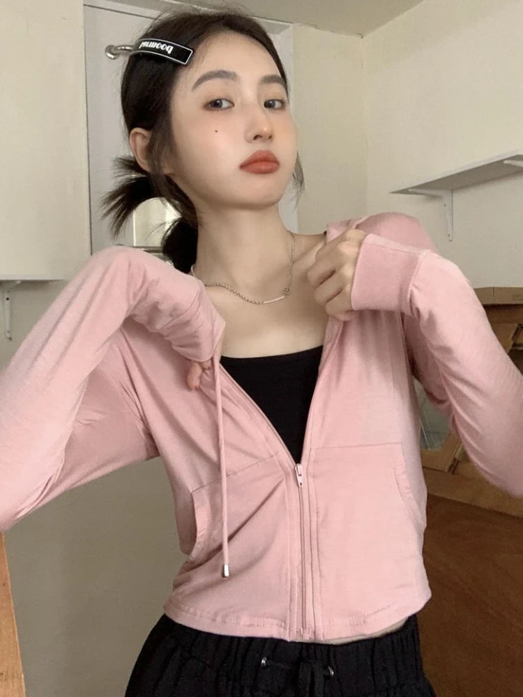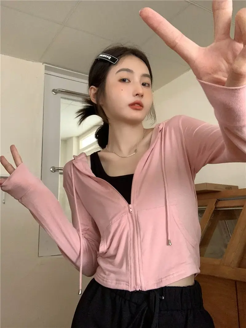 Hooded Jackets Women Thin Sunscreen Solid Fashion Summer Long Sleeve Cropped Coats All-match College Breathable Sporty Popular