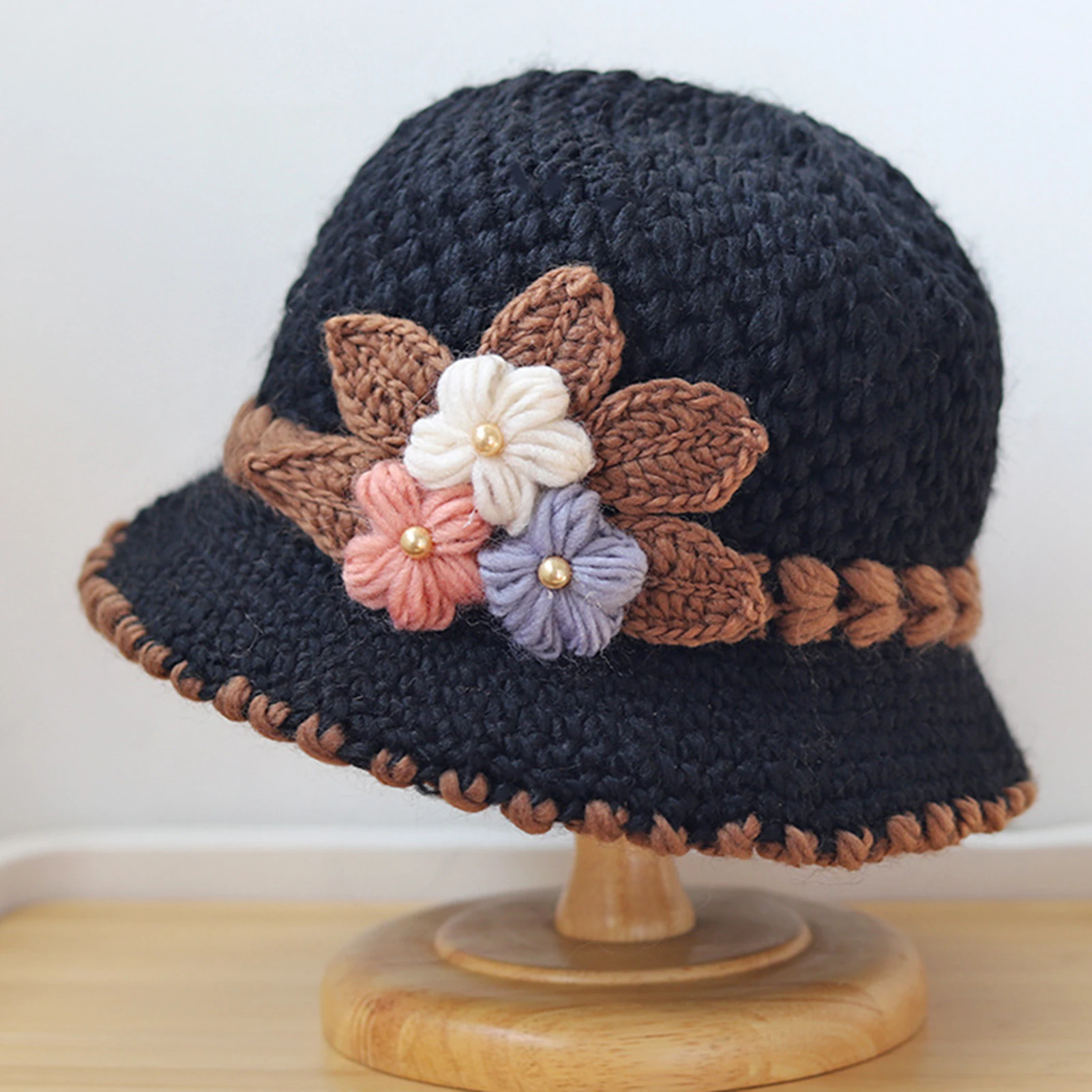 Knitted Hat Women's Autumn And Winter Wool Hat Classic Winter Women's Hat Flower Fleece-lined Bucket Hat Mother Warm Winter Hat