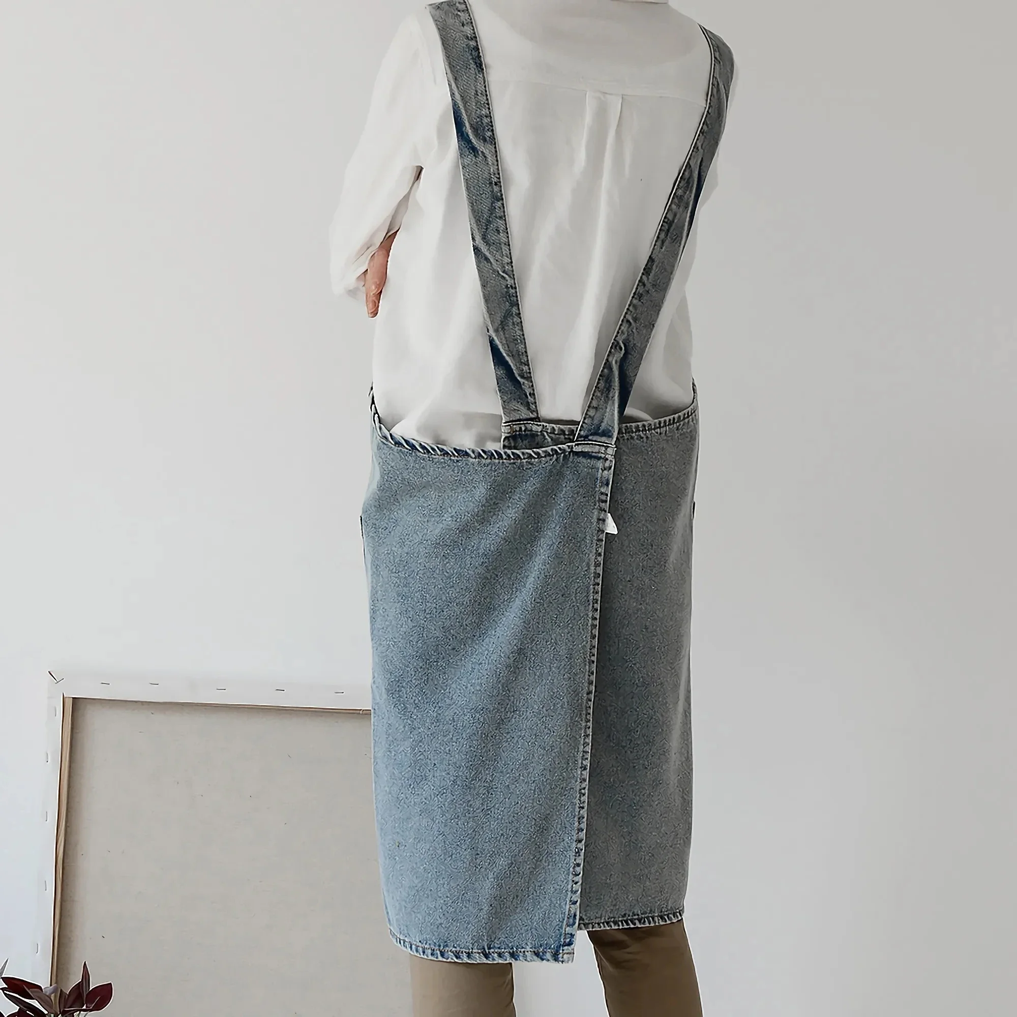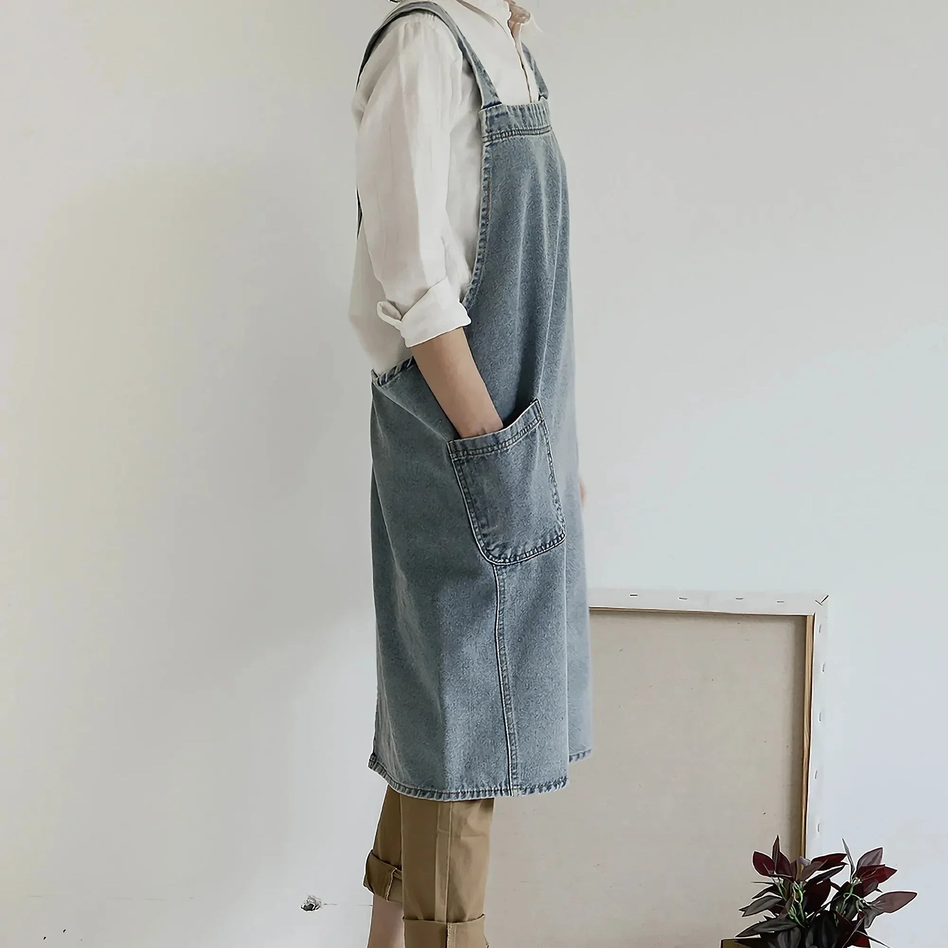 Korean Lady Dress Denim Apron For Woman Cotton Fabric Garden Kitchen Baking Cooking Aprons Household Cleaning Accessories