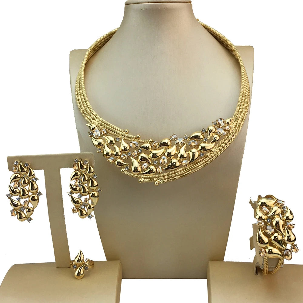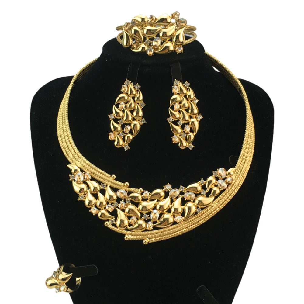 Luxury Design Gold Color Jewelry Set For Women Quality Trending Necklace Earrings Bracelet And Ring Wedding Party FHK19490