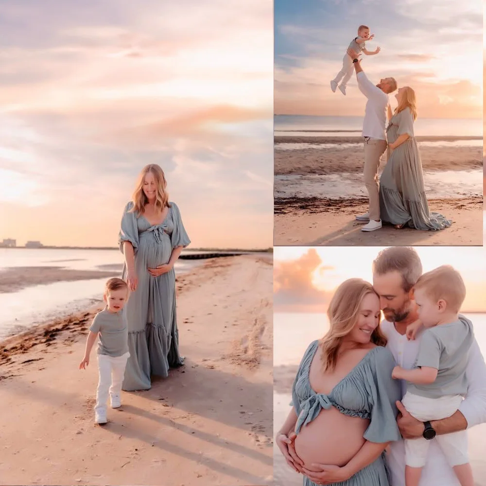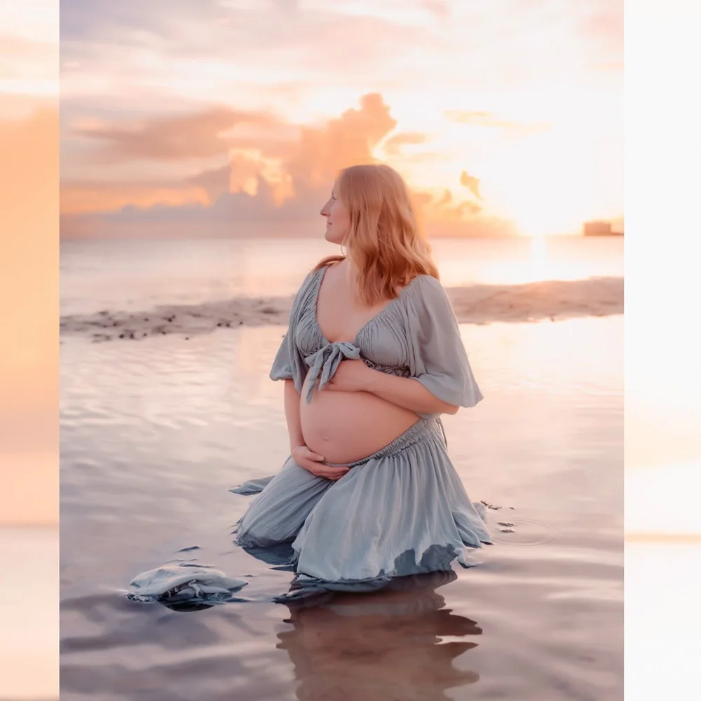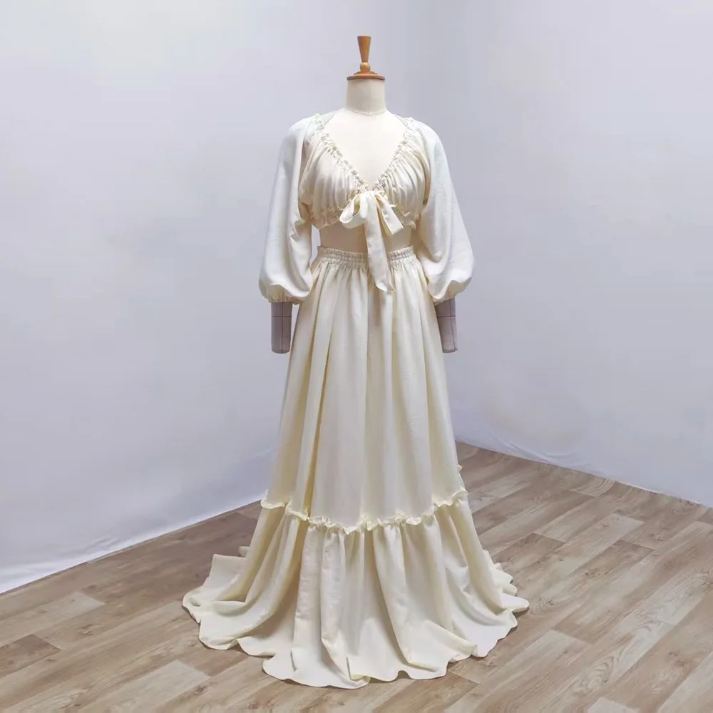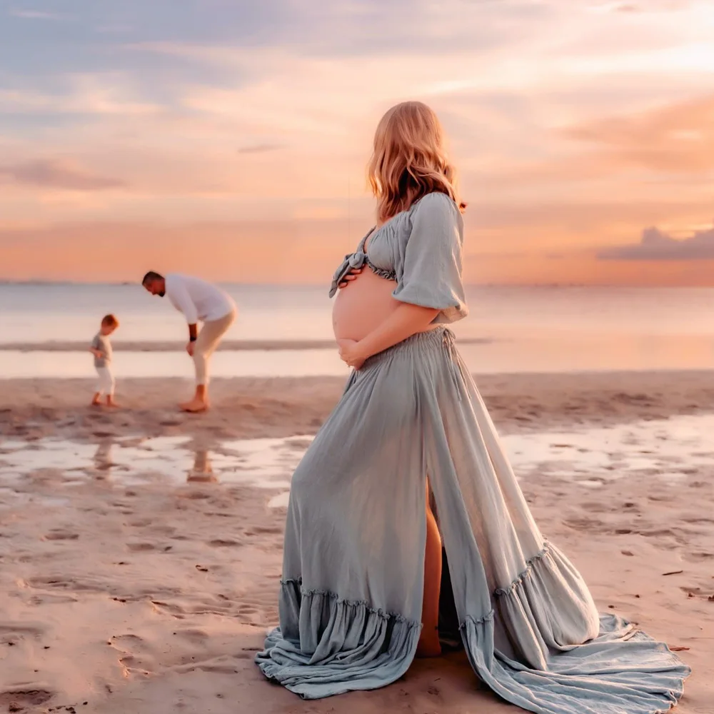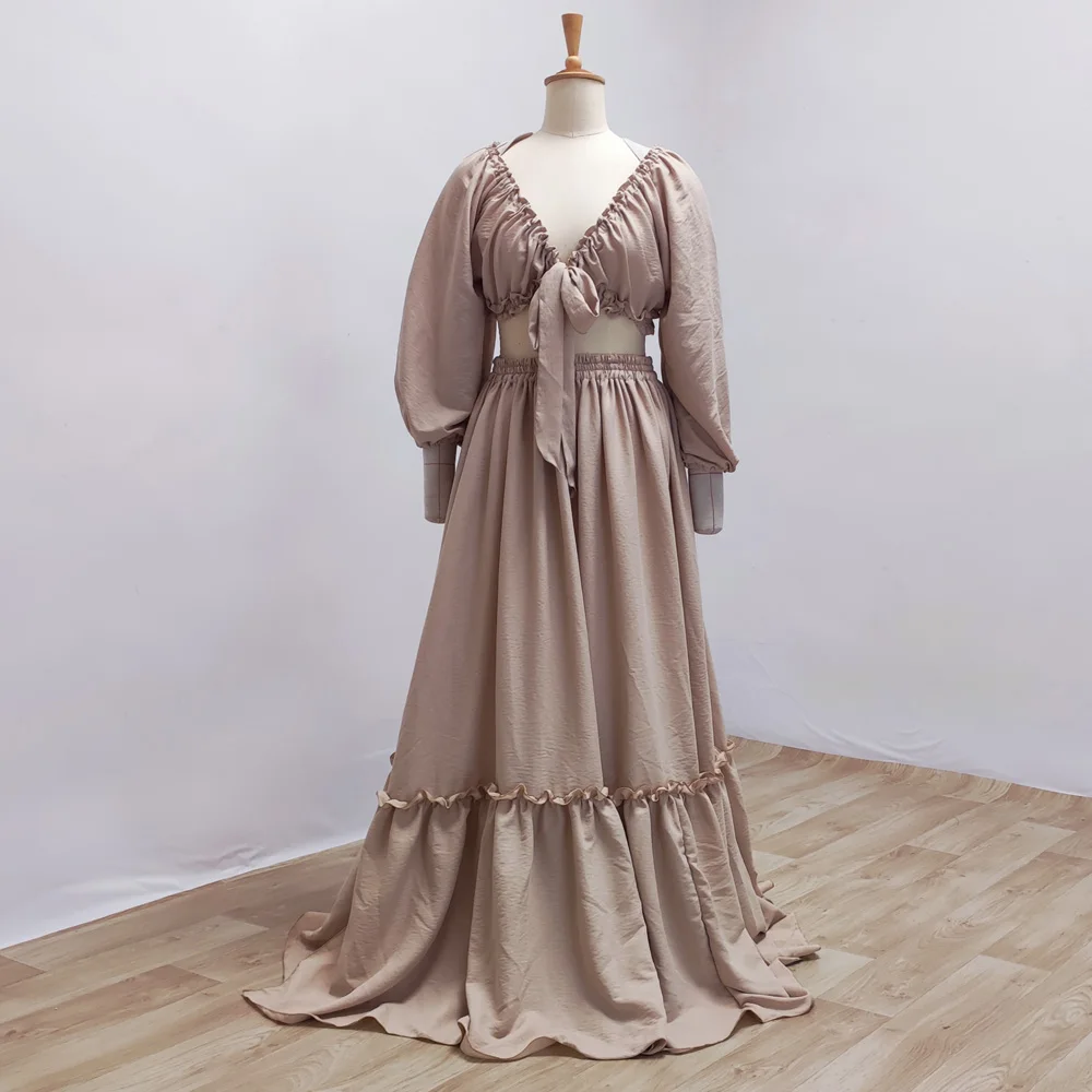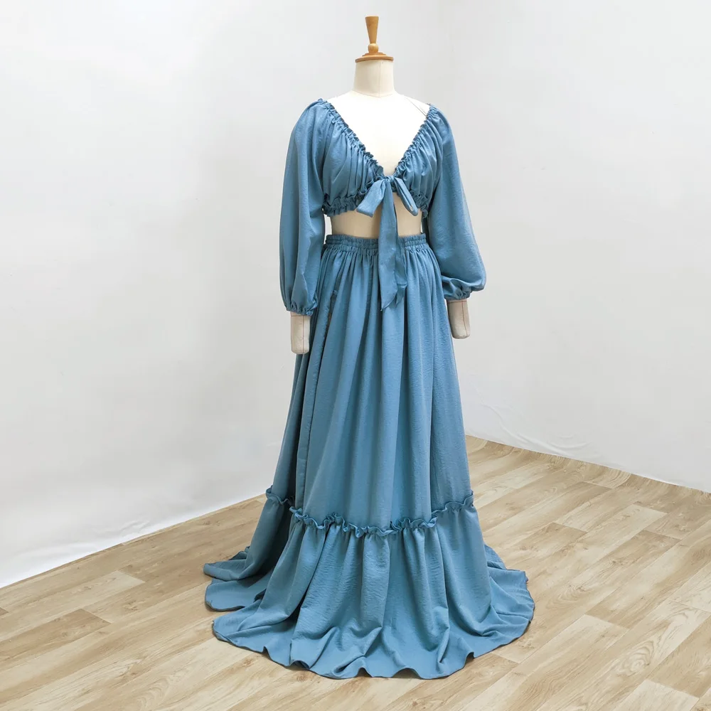 Maternity Photography Dresses Soft Cotton-Like Dress V-neck Tie Up Top A-line Skirt Two-Piece Set Clothes For Pregnant W