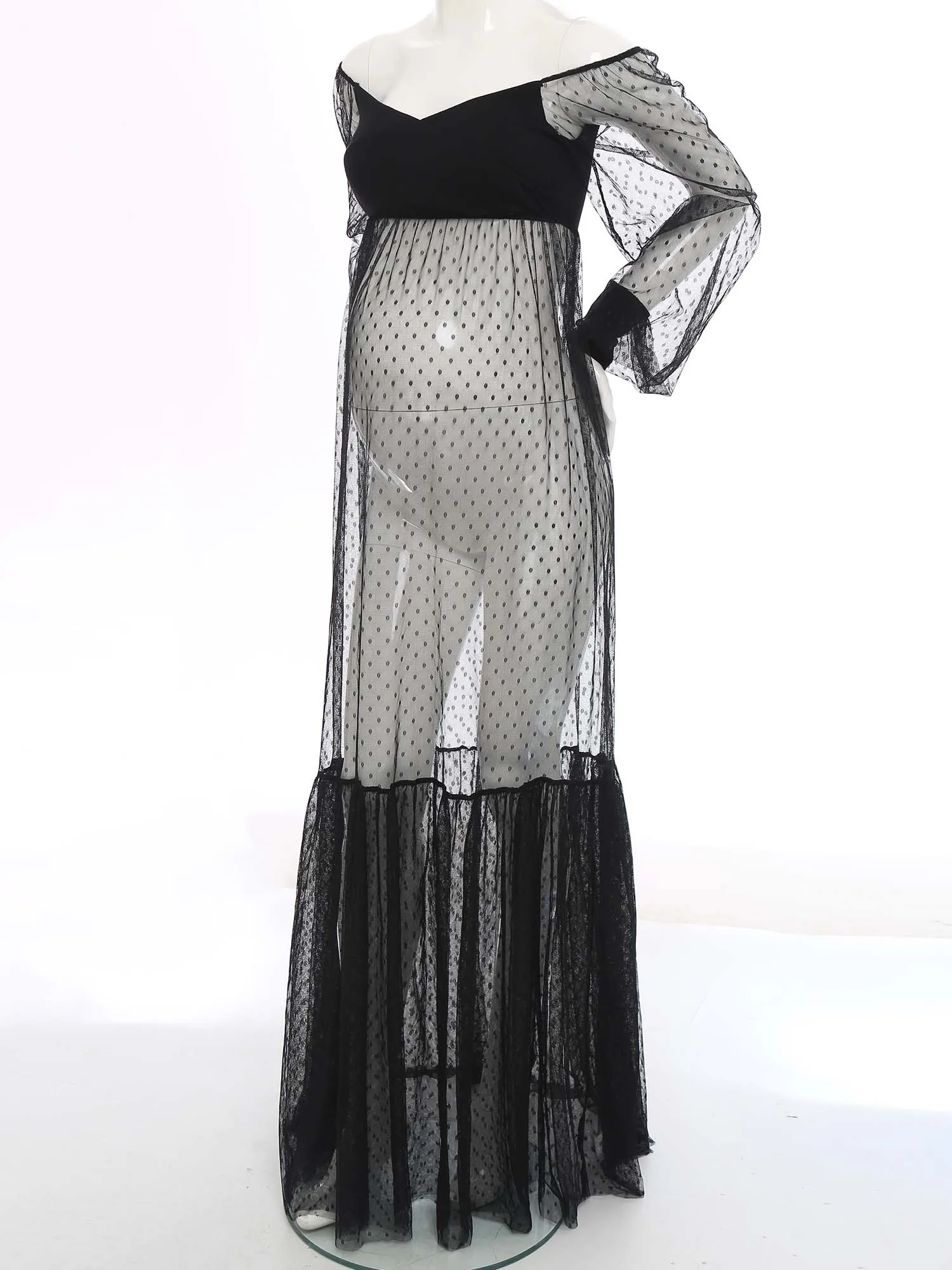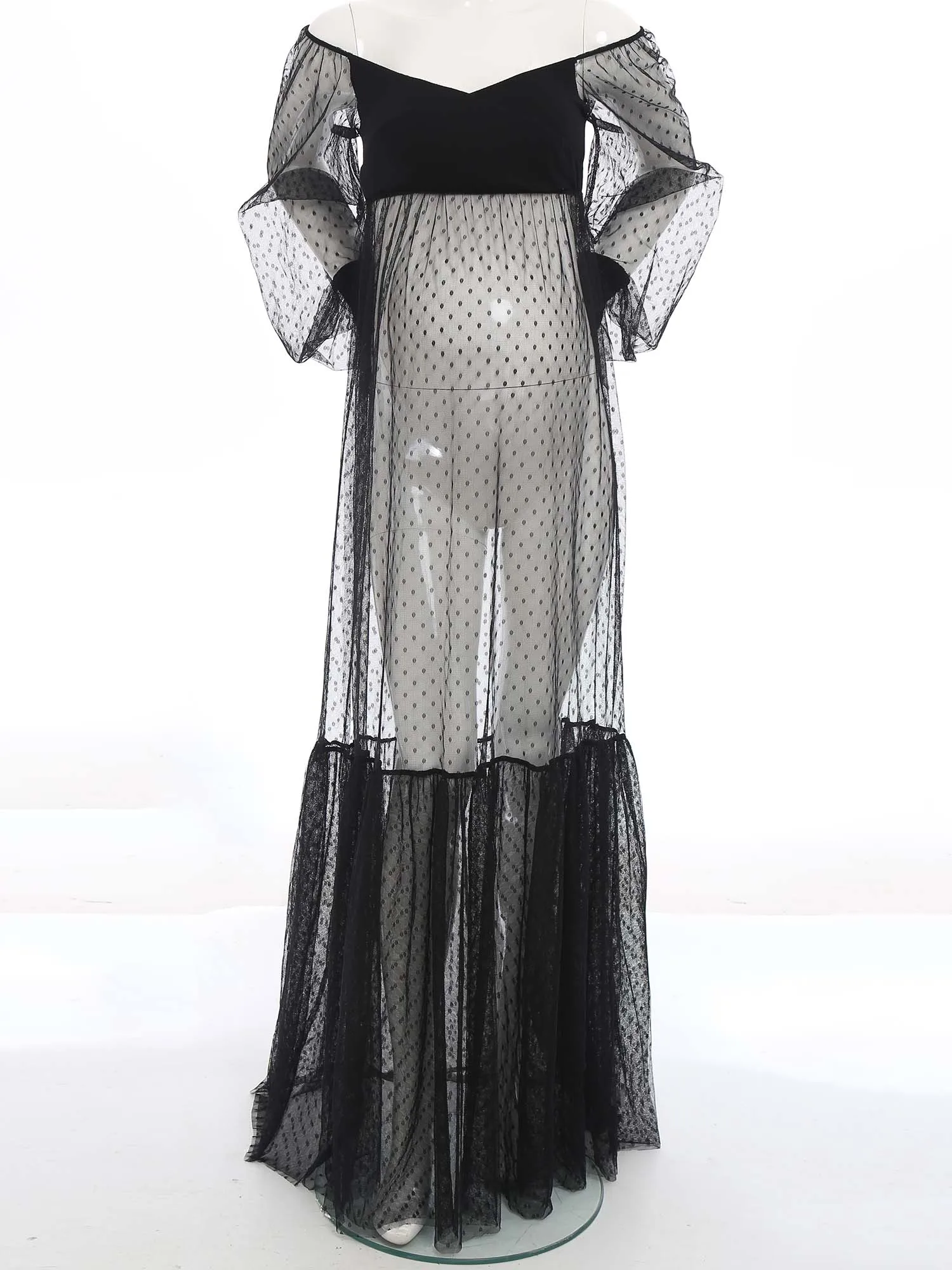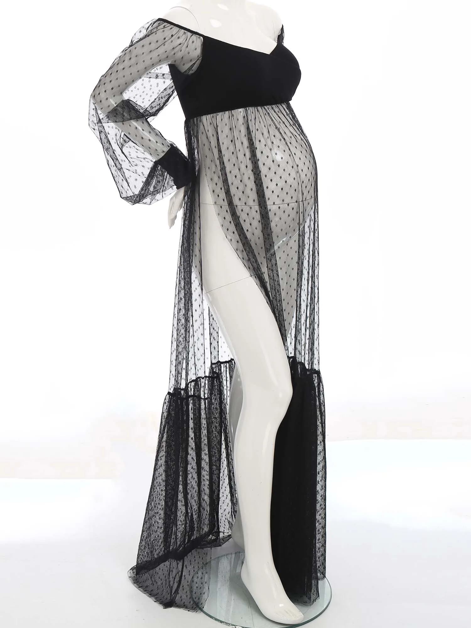 Maternity Pregnancy Photography Dress Bubble Sleeve Off-shoulder Polka Dots Sheer Mesh Split Maxi Gown for Party Sleepwear