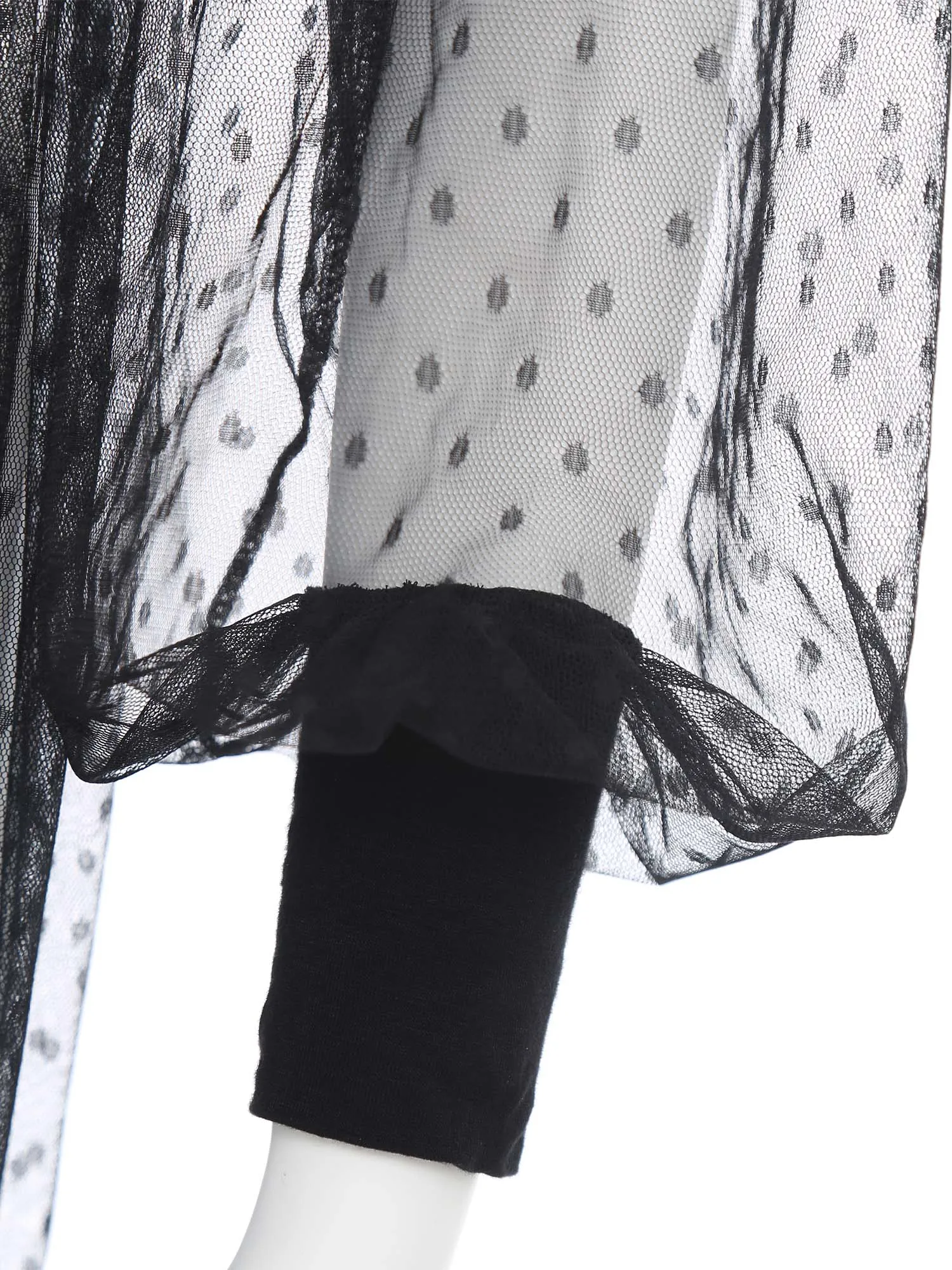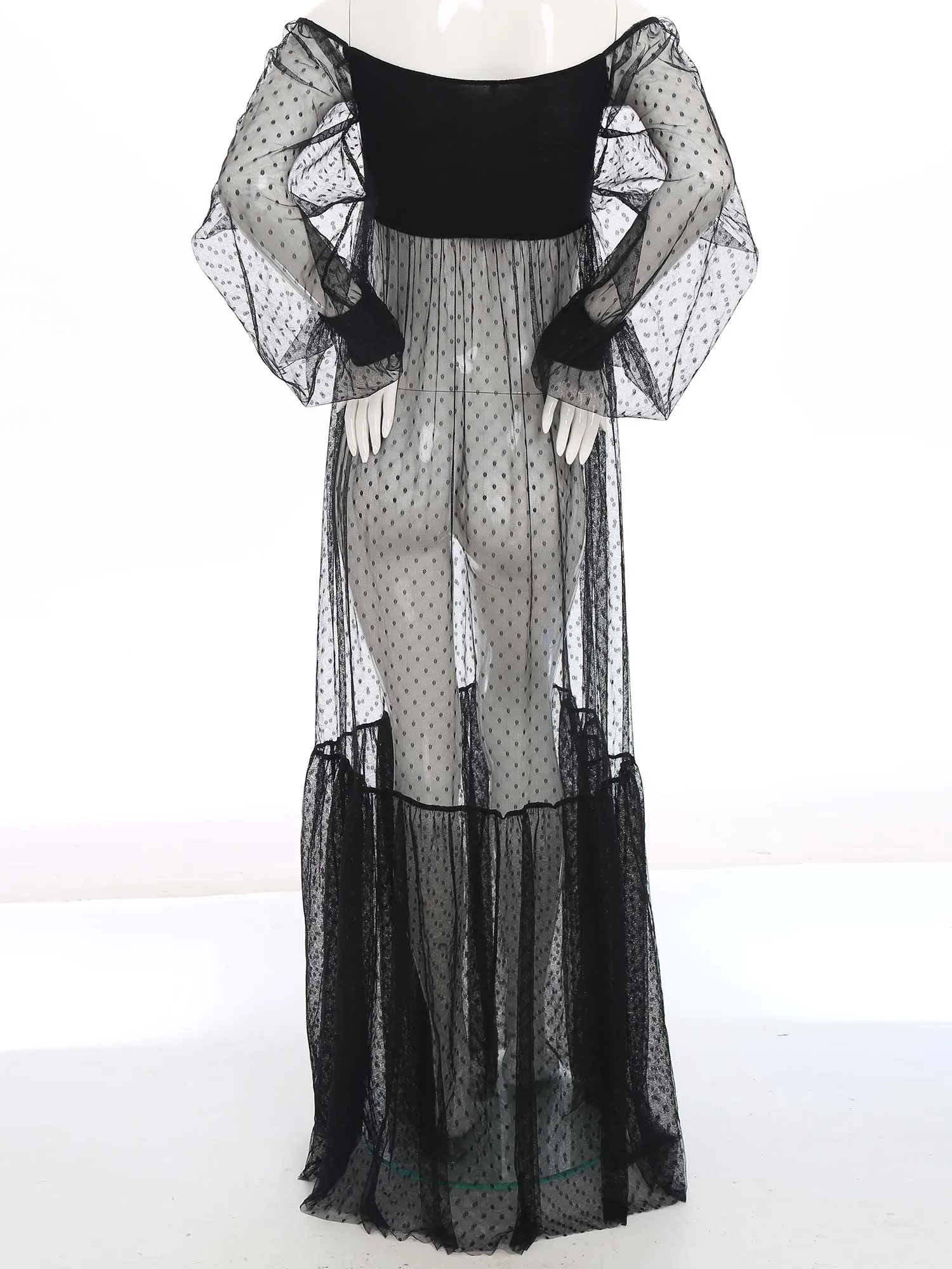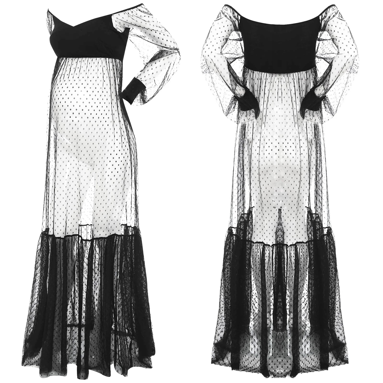 Maternity Pregnancy Photography Dress Bubble Sleeve Off-shoulder Polka Dots Sheer Mesh Split Maxi Gown for Party Sleepwear