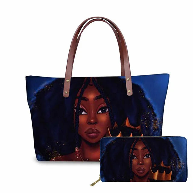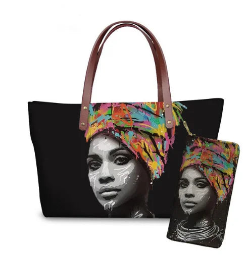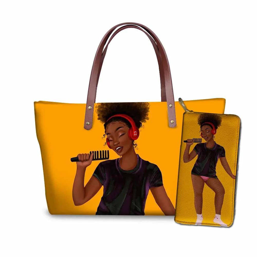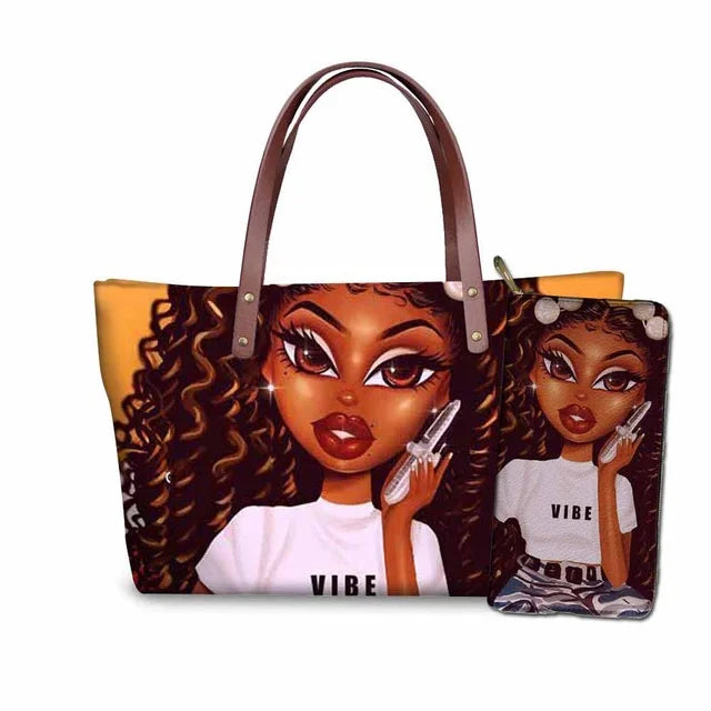 MOQ1 Customized Logo Designer Luxury Women's Handbags Black African Beauty Girl Printed Purses Set Top Handle Handbag for Summer