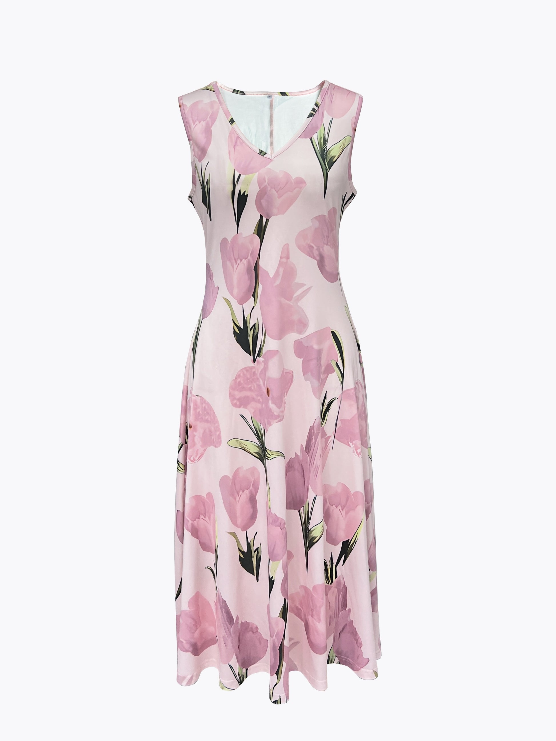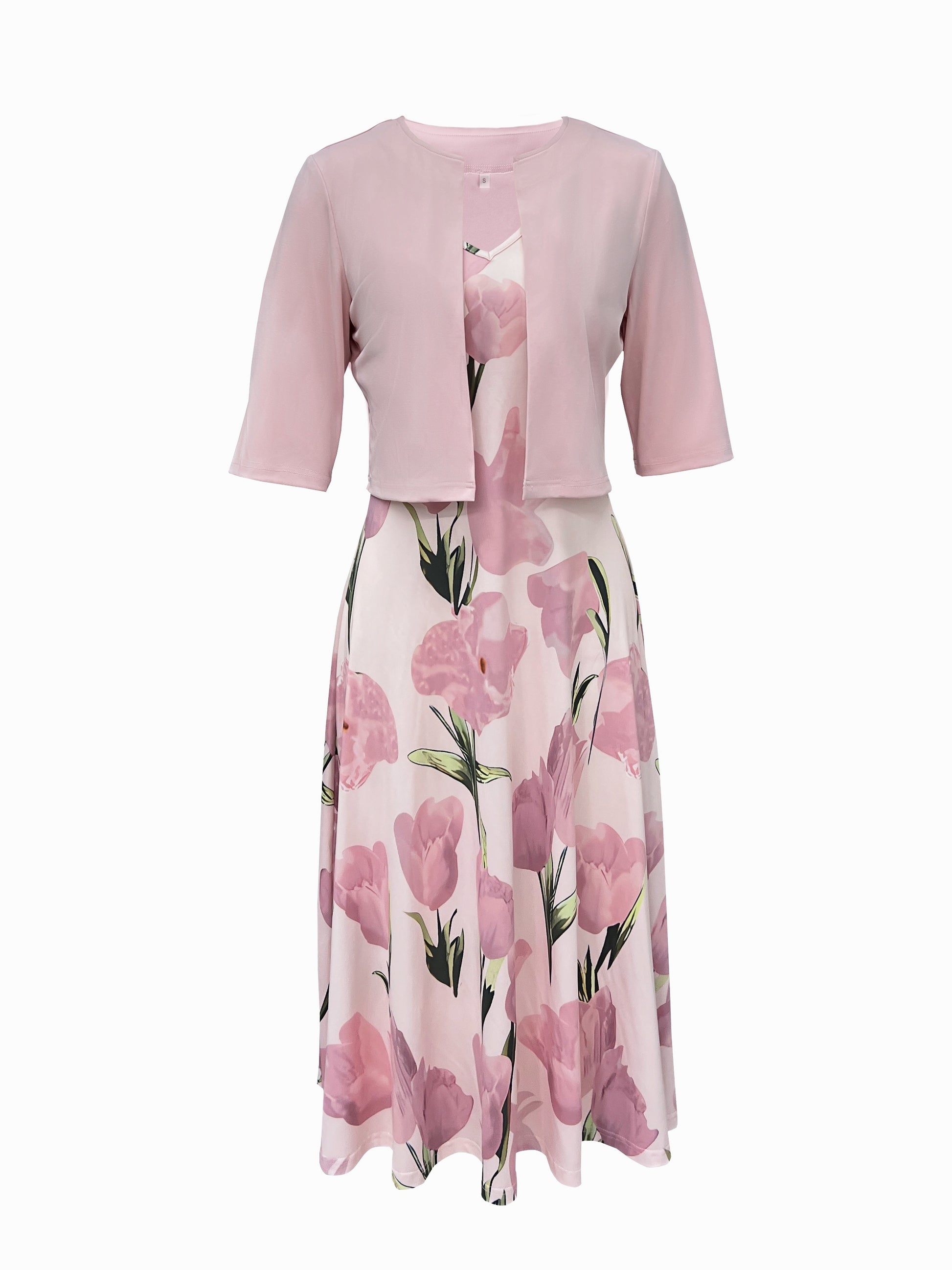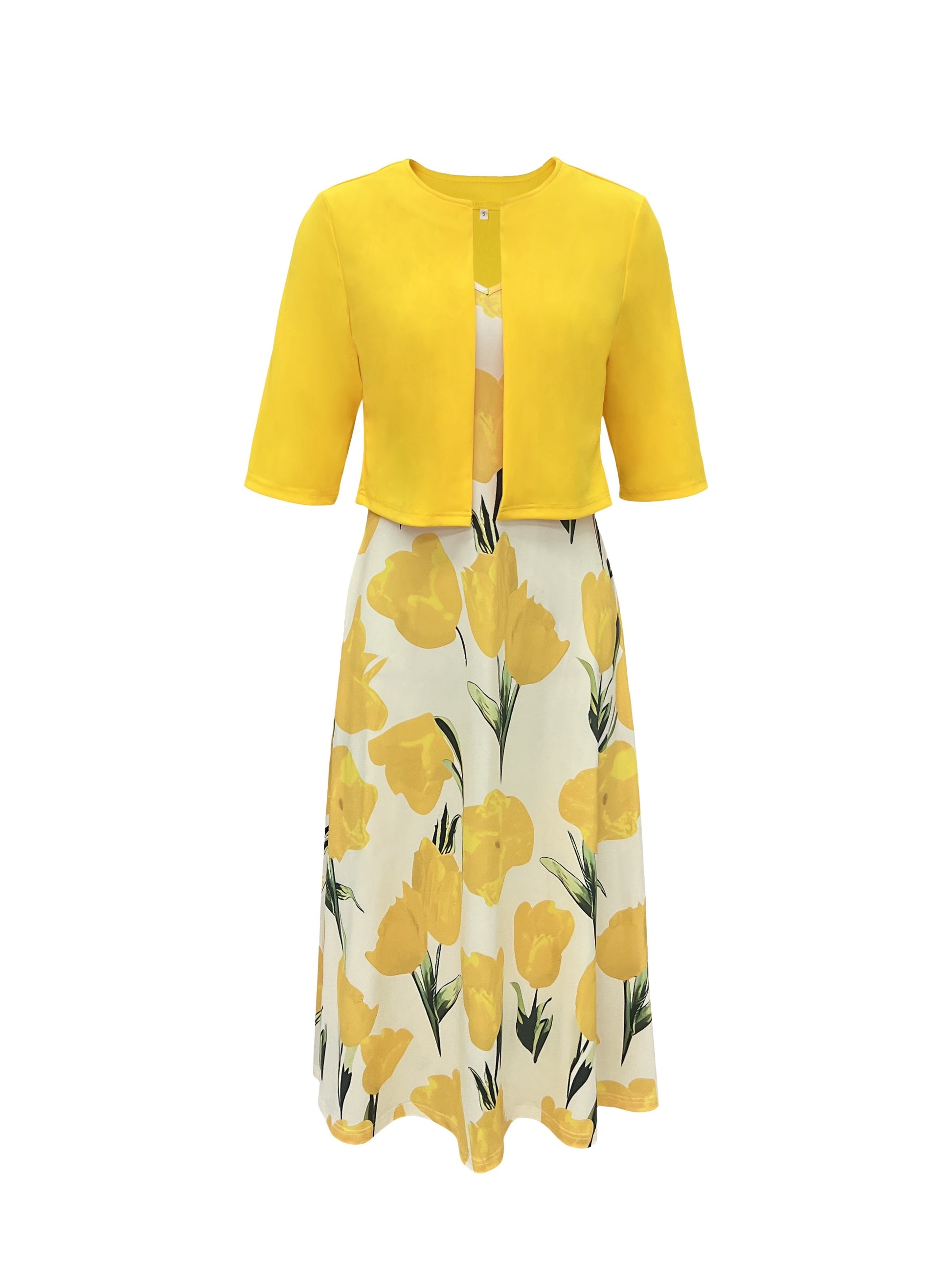 Plus Size Floral Print Two-piece Dress Set, V Neck Sleeveless Dress & Half Sleeve Open Front Top Outfits, Women's Plus Size Clothing