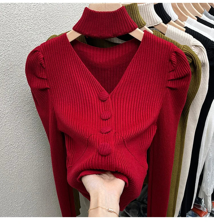 Red Sweater Knitted Sweater Women's Inner Layering Shirt with Unique Unique V-neck Halter Top Design for Autumn and Winter