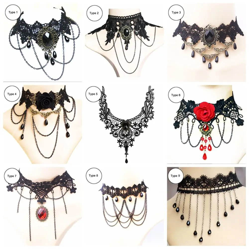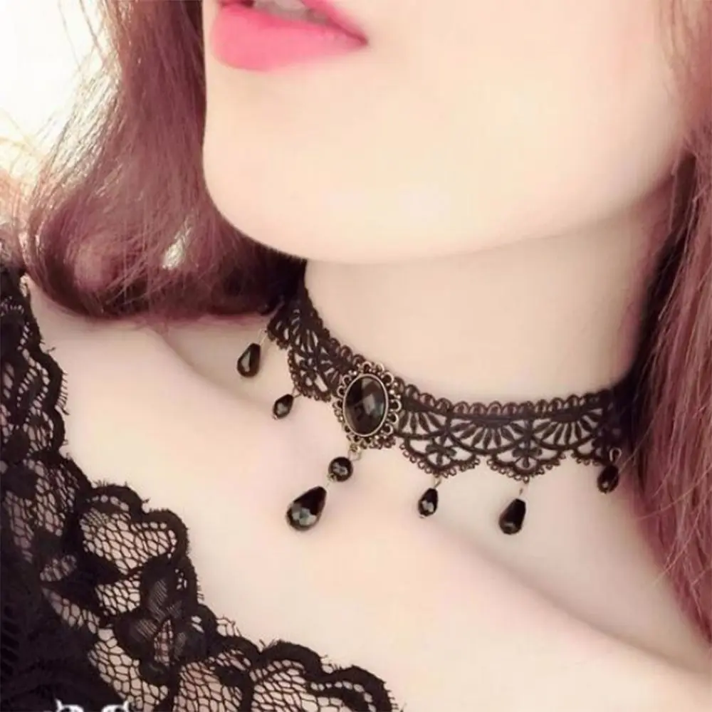Sexy Black Lace Necklace Vintage Gothic Necklace Steampunk Style Beads Pendant Exquisite Women Choker Fashion Jewelry