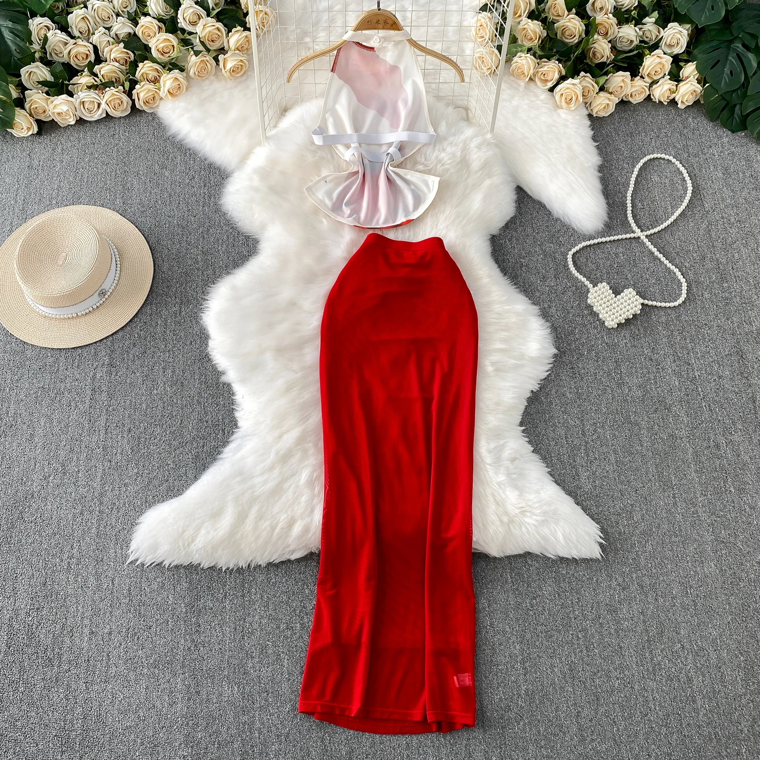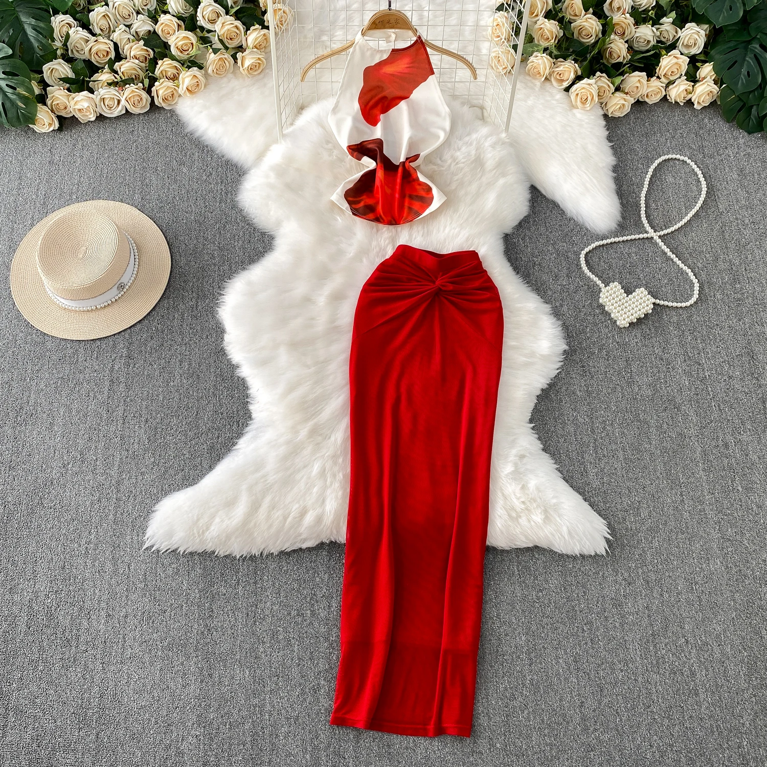 Sexy Elegant backless print Slim Slip Dress Casual Beach Party Vintage Women Summer Fashion Clothing Two Piece Set