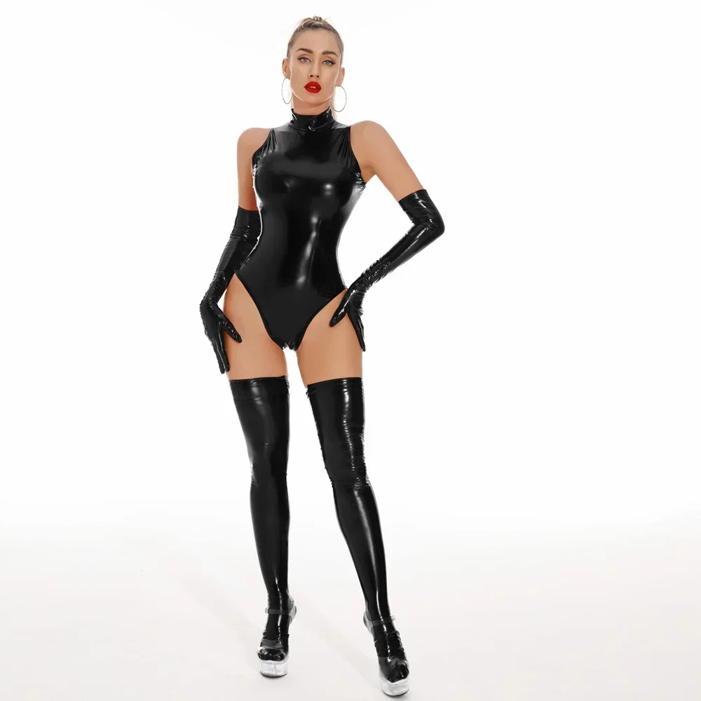 Sexy Women Wetlook High Cut Bodysuit Cosplay Shiny Maid Tight PU Faux Leather Elastic Club Dance Leotard Sexy Lingerie Costume