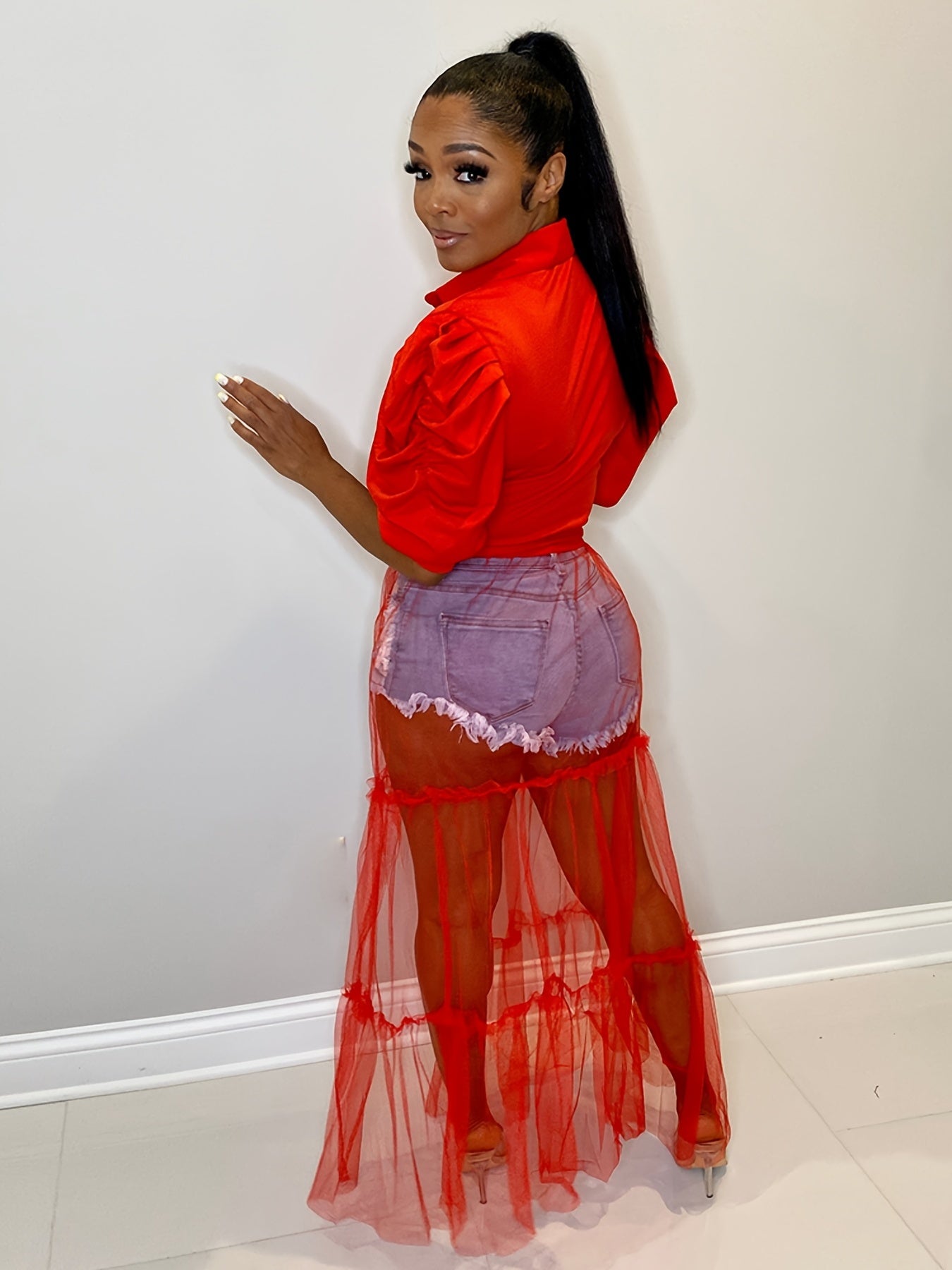 Shirt Top Stitching Mesh Dress, Sexy Short Sleeve Turn Down Collar Tie Waist Dress, Women's Clothing