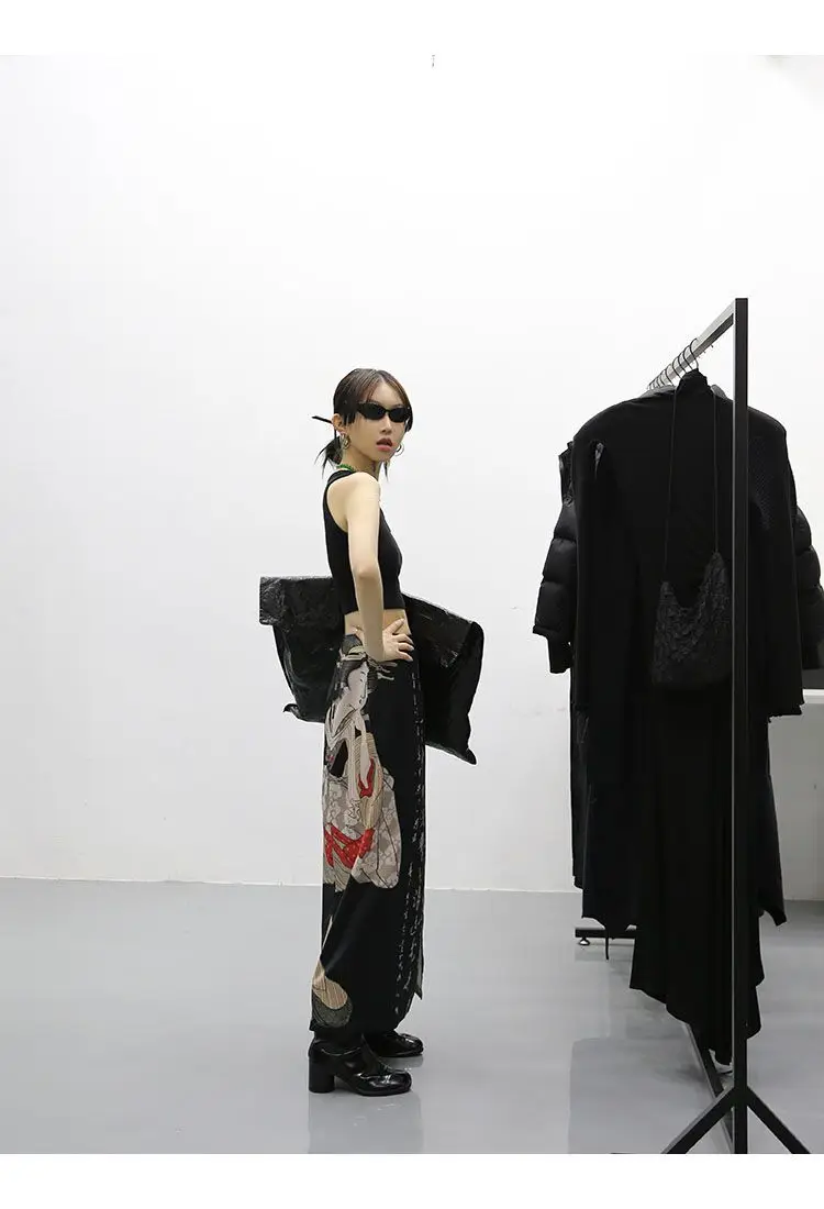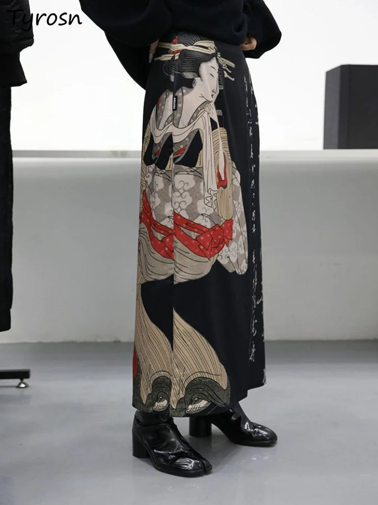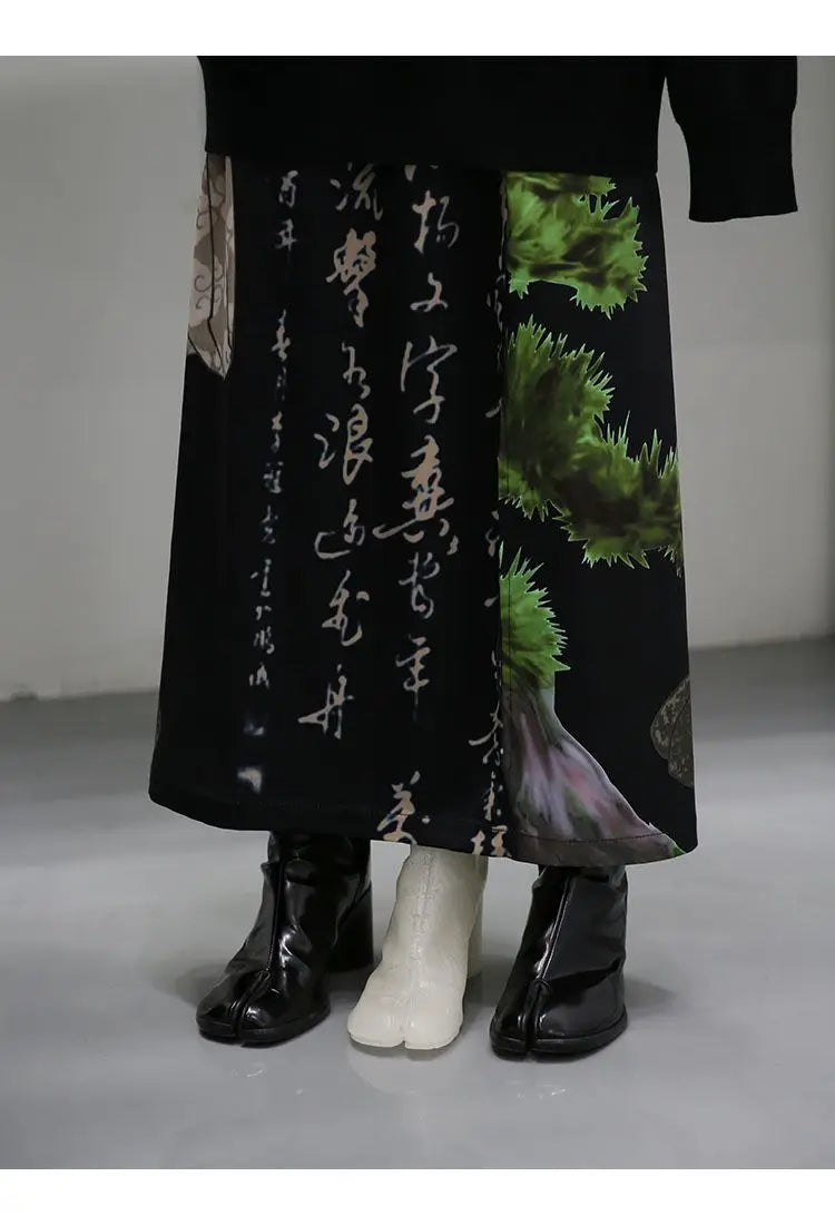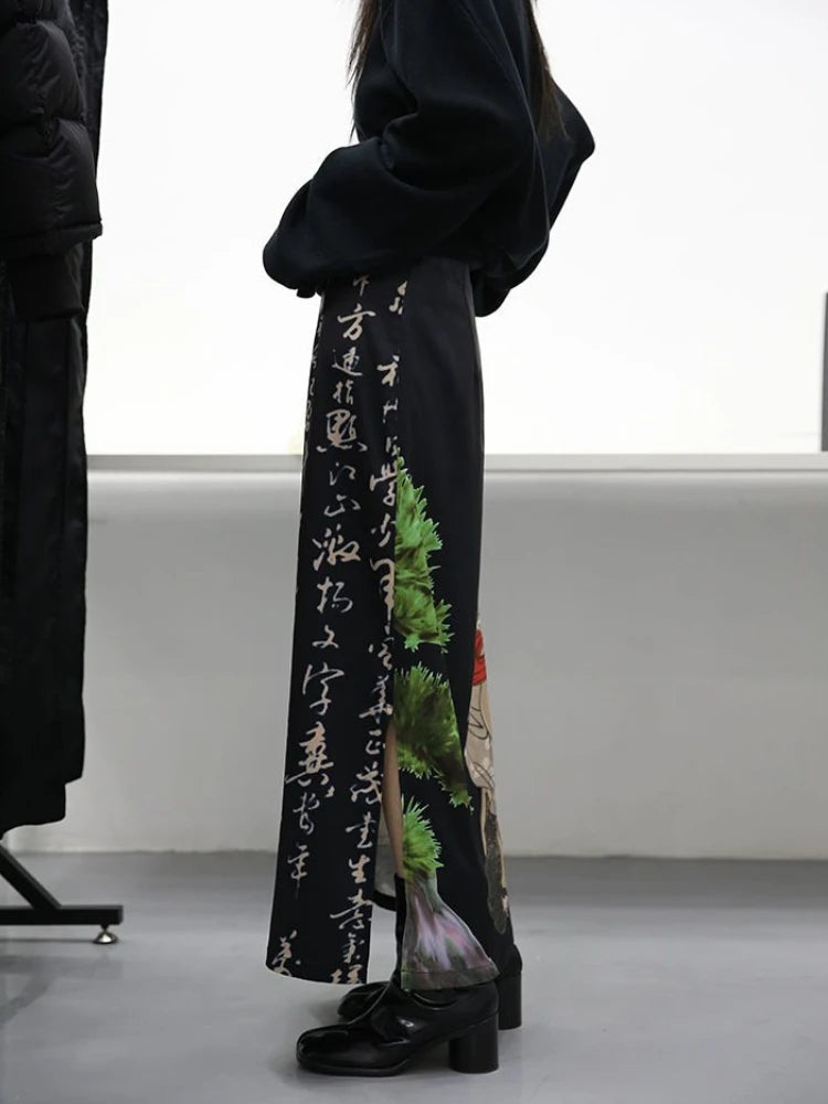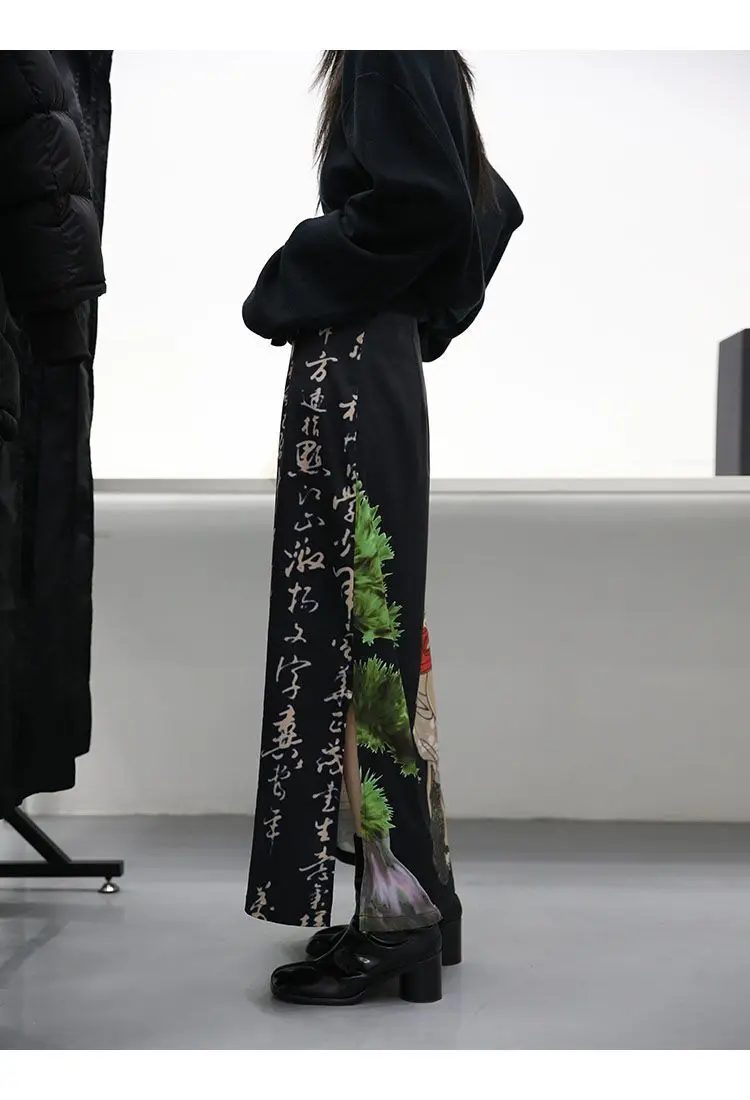 Skirts Women Cool Design Side-Slit Retro Leisure Simple Chinese Style Print All-match Comfortable High Waist Fashion Streetwear