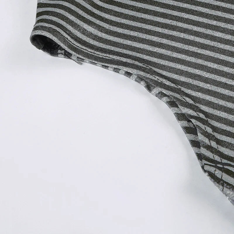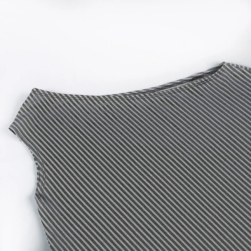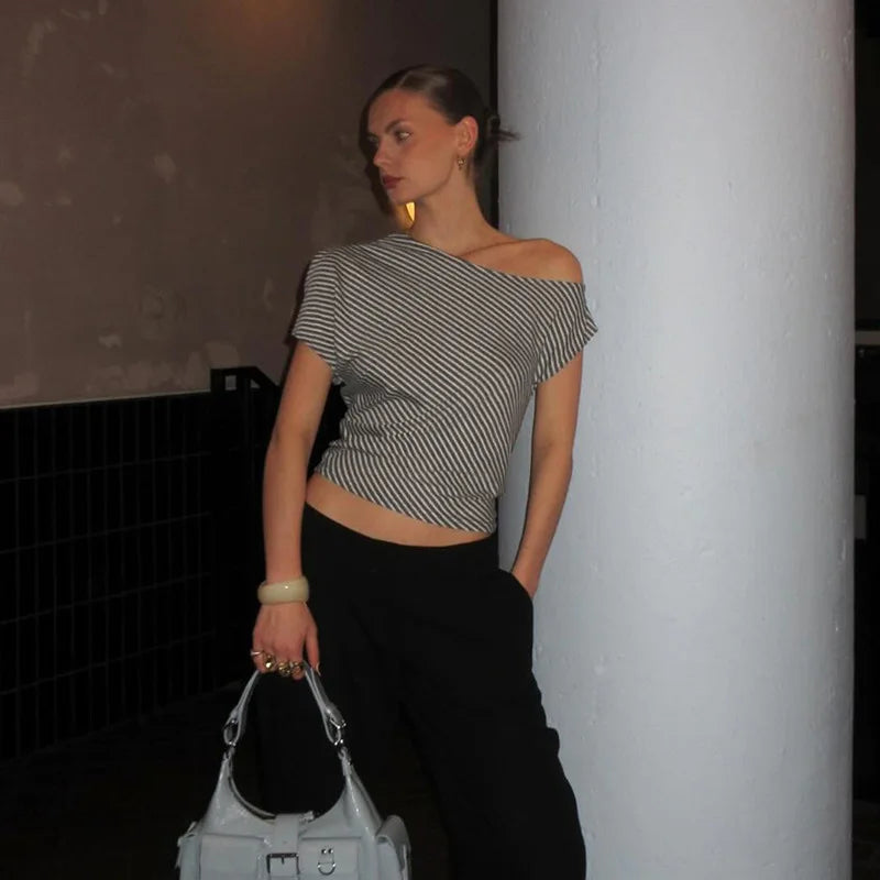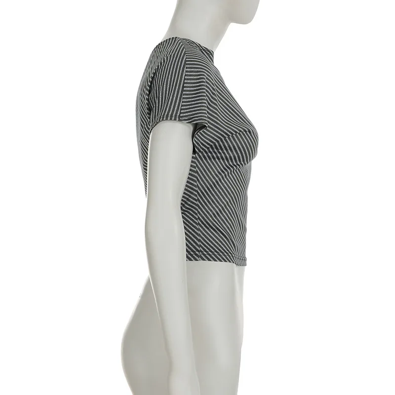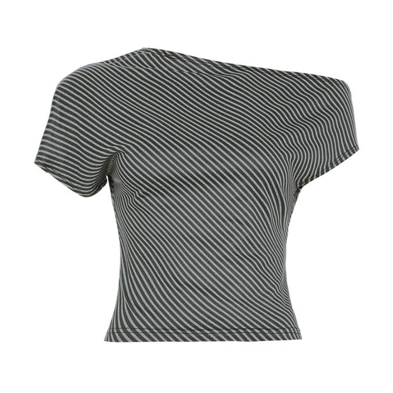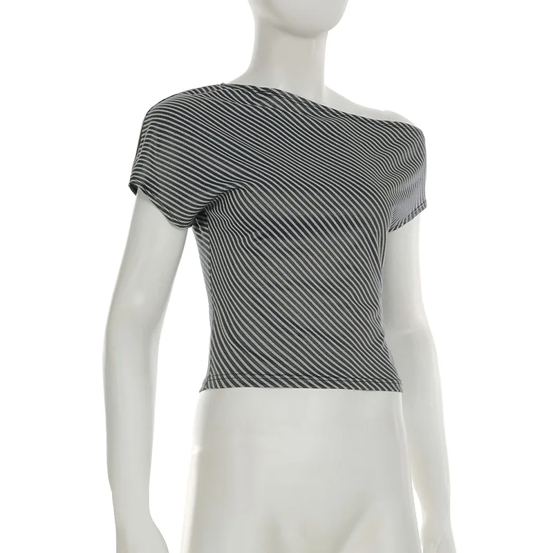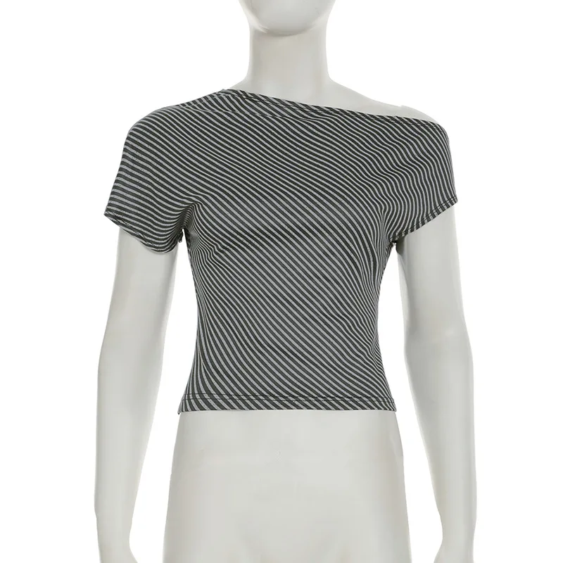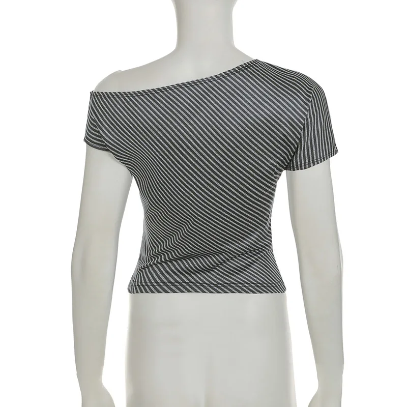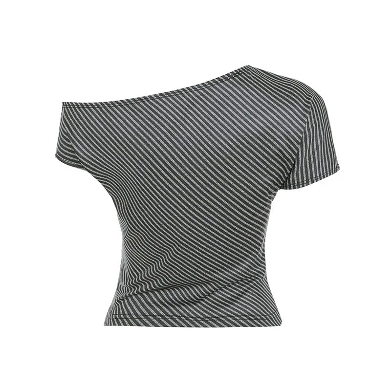 Striped T Shirts For Women Streetwear Inclined Collar Crop Top Y2k Accessories Short Sleeve Grunge Clothes Ropa Mujer Camisetas
