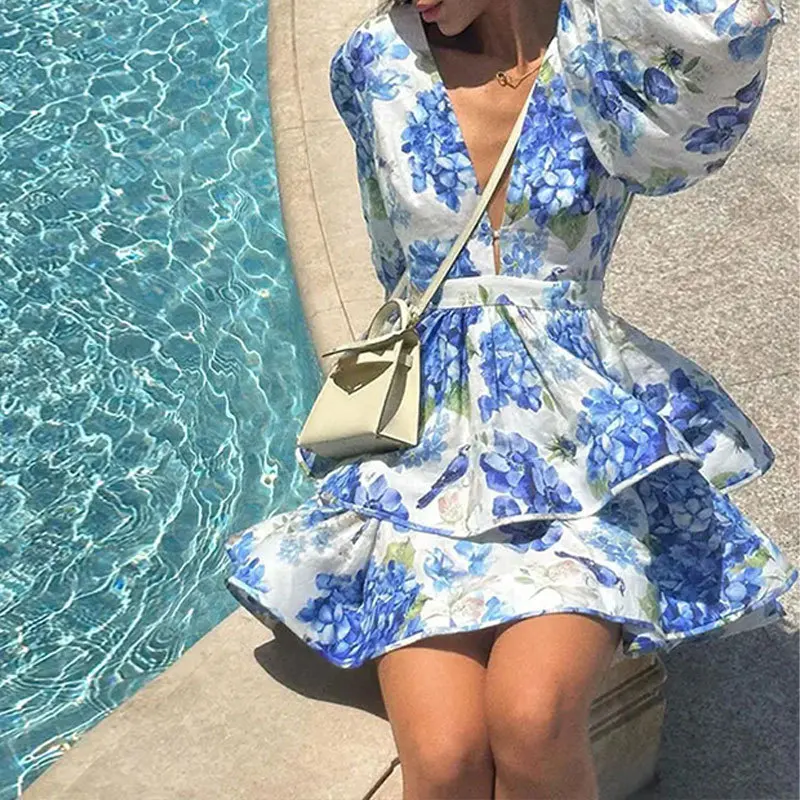 Stylish And Elegant Flower Print Women's Mini Dress Chic V-neck Puff Long Sleeve Double Layer Ruffle Mini Dress 2024 Autumn New