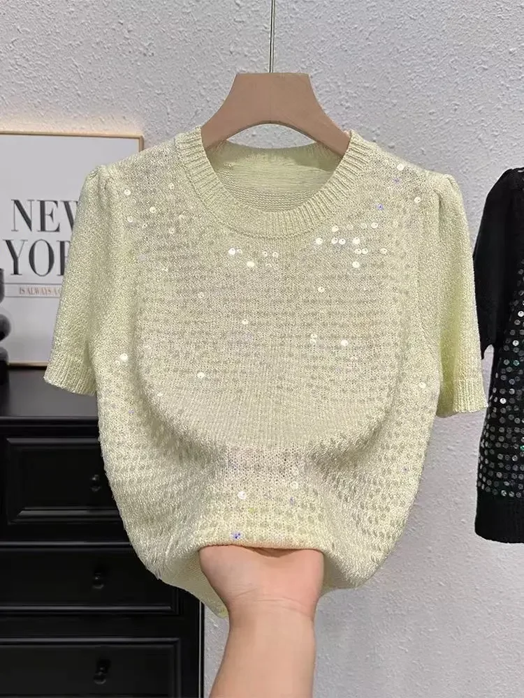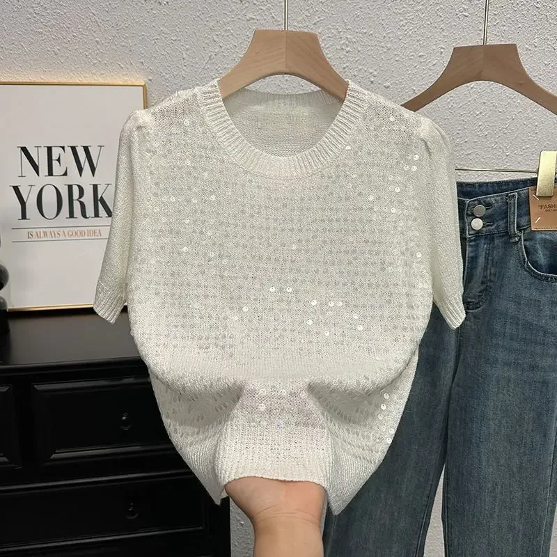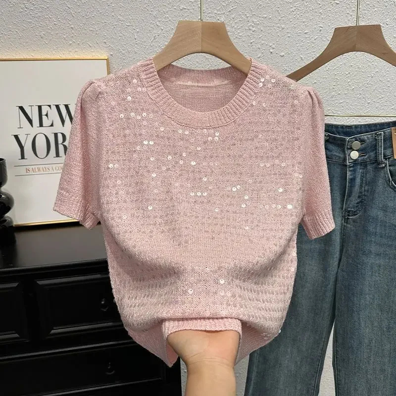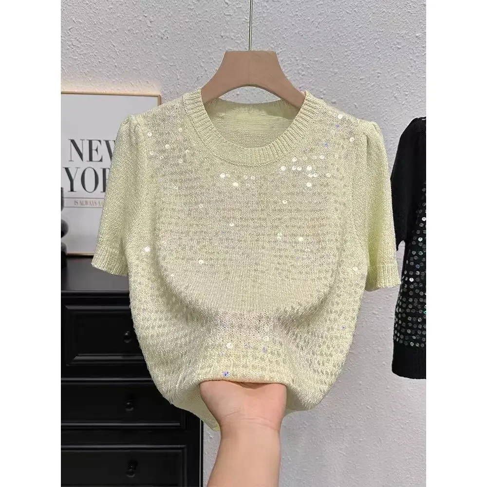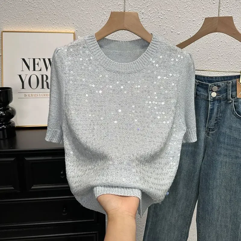 Summer Sweater Short-sleeved T-shirt for Women Temperament and Fashionable Versatile Half-sleeved Sweater Sequin Top