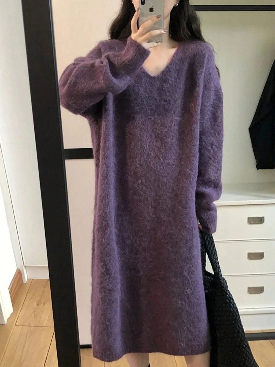 Sweater for Woman Autumn Winter Lazy Style V Neck Knitted Dresses Korean Fashion Casual Loose Thickened Warmth Sweaters Dress