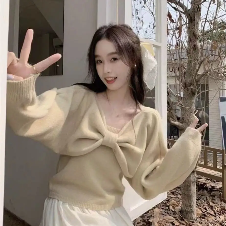 Sweater Suit for Women Two-piece 2025 Autumn New Suspender Vest Bow Long Sleeve Short Top
