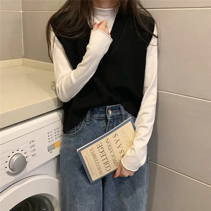 Sweater Vest Women Solid Autumn Winter All-match Leisure Outerwear Knitted V-Neck Sleeveless Female Elegant Chic Simple Harajuku