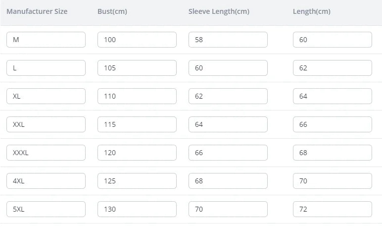 size_info: {"sizeInfoList":[{"length":{"cm":"100","inch":"39.37"},"size":"M","vid":-1},{"length":{"cm":"105","inch":"41.34"},"size":"L","vid":-2},{"length":{"cm":"110","inch":"43.31"},"size":"XL","vid":-3},{"length":{"cm":"115","inch":"45.28"},"size":"XXL","vid":-4},{"length":{"cm":"120","inch":"47.24"},"size":"XXXL","vid":-5},{"length":{"cm":"125","inch":"49.21"},"size":"4XL","vid":-6},{"length":{"cm":"130","inch":"51.18"},"size":"5XL","vid":-7}]}
