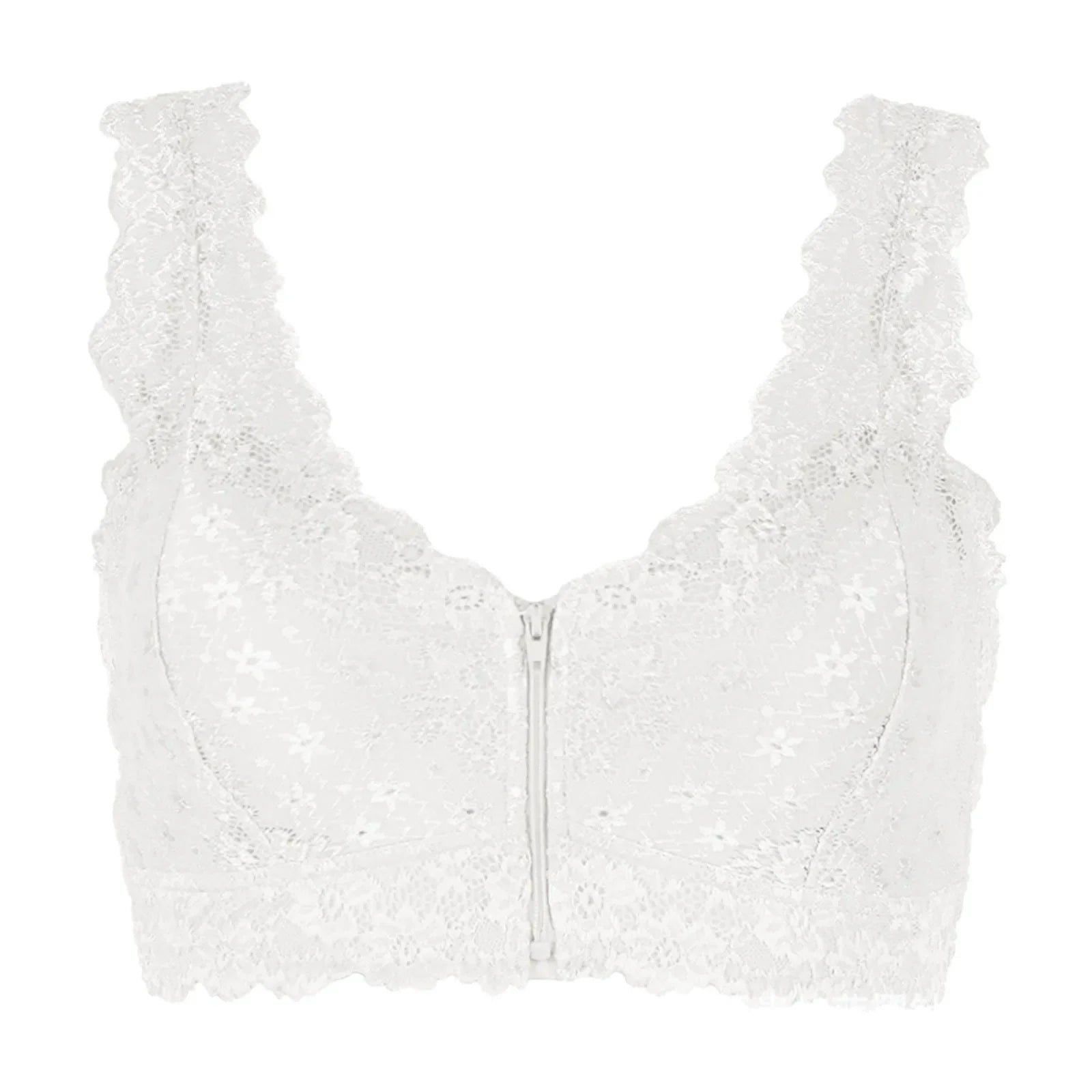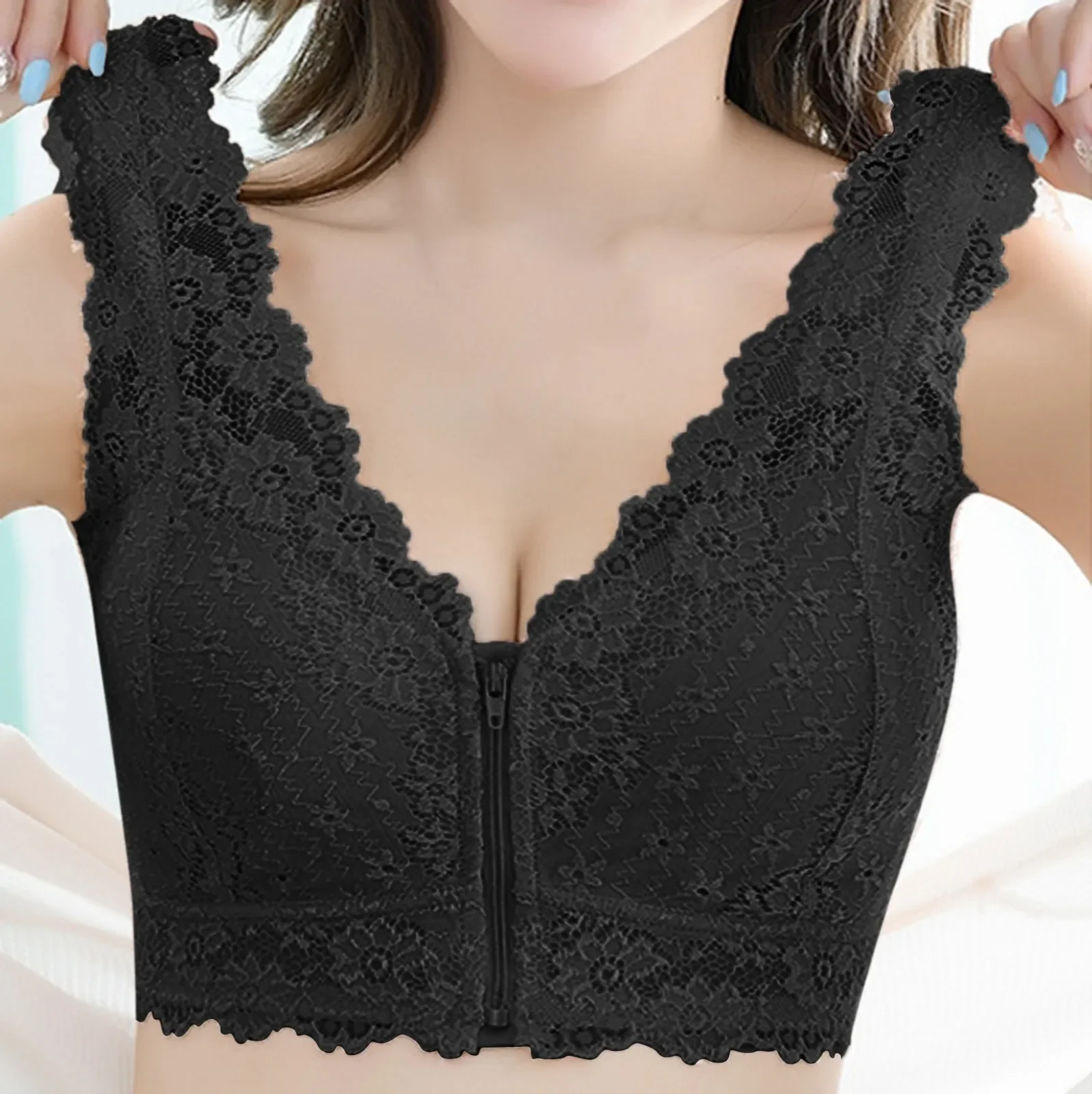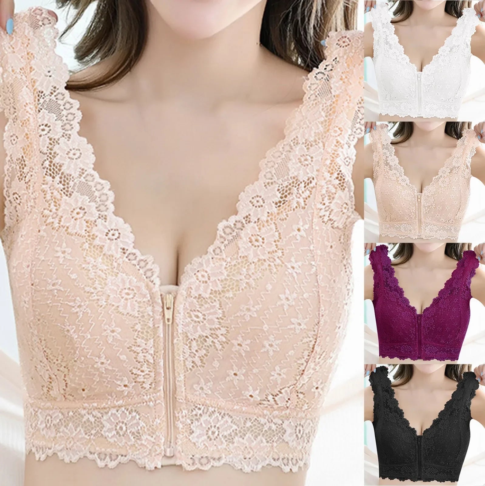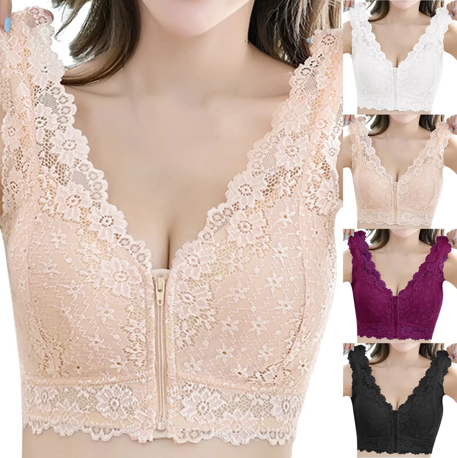Women Bra Women'S Comfortable And Sexy Large Lace Lace Strap With Strap Deep V Front Zipper Bra Floral Lace Trim Underwear