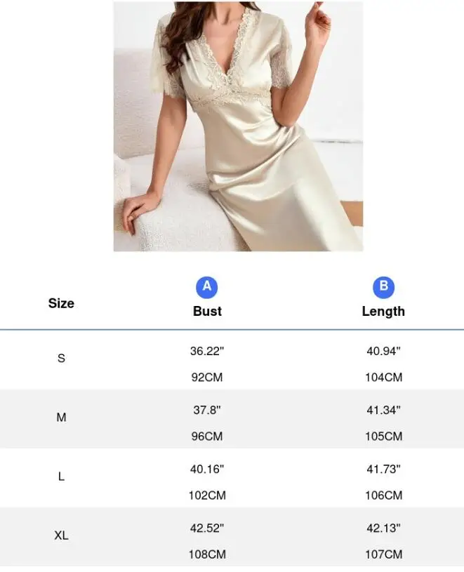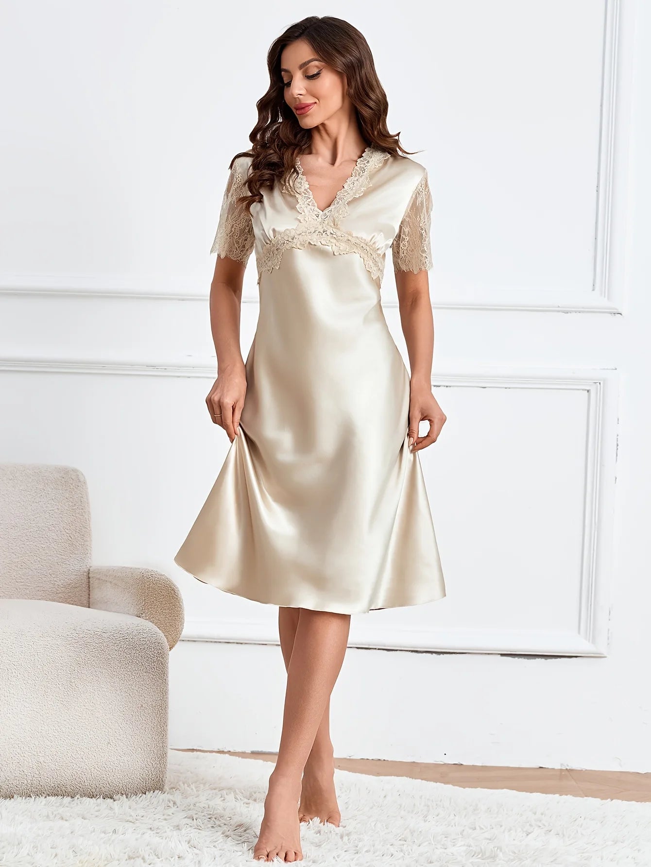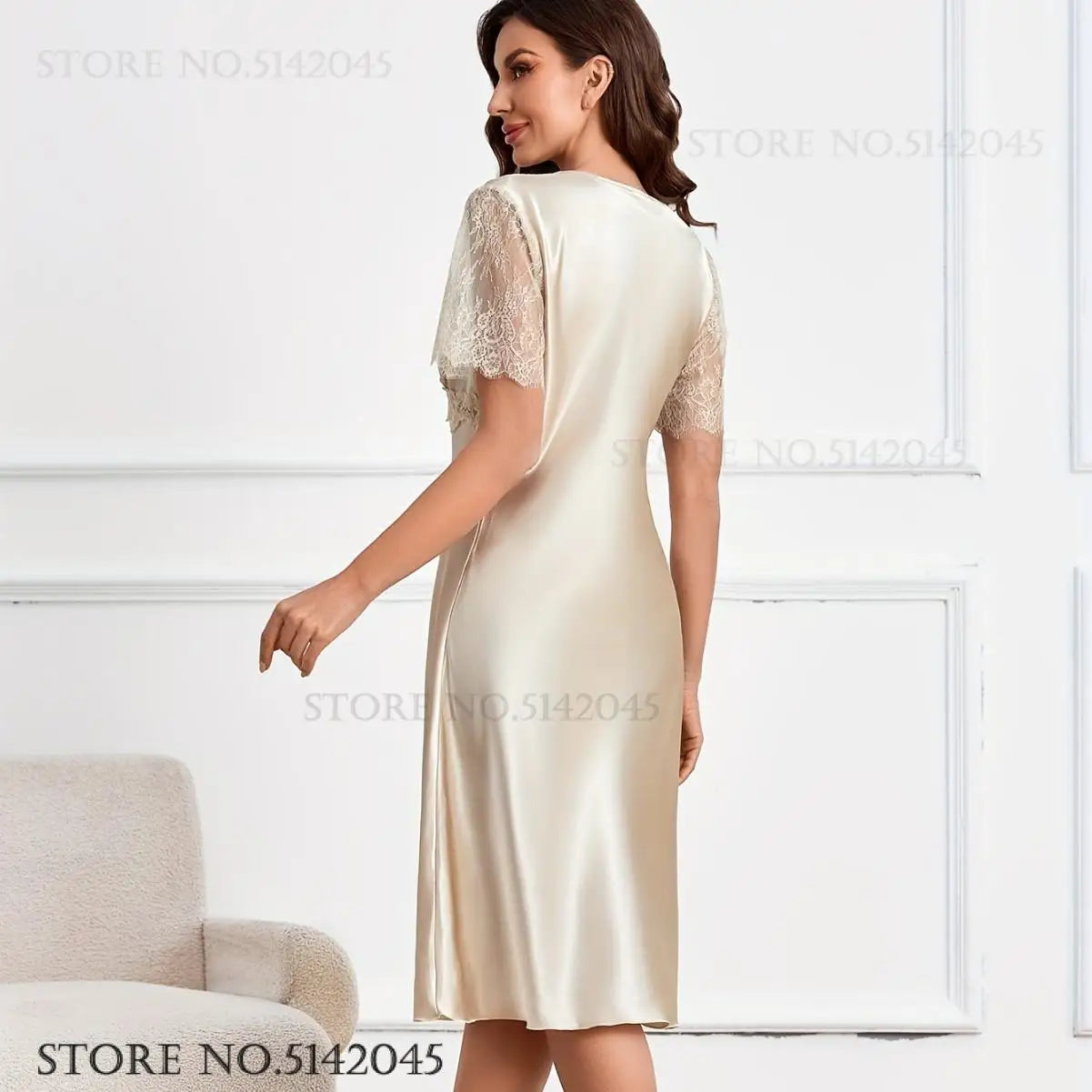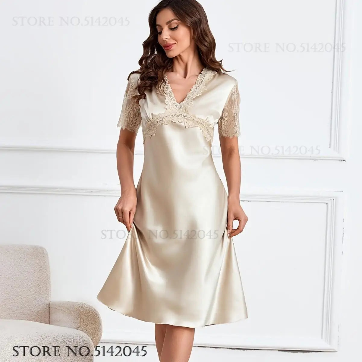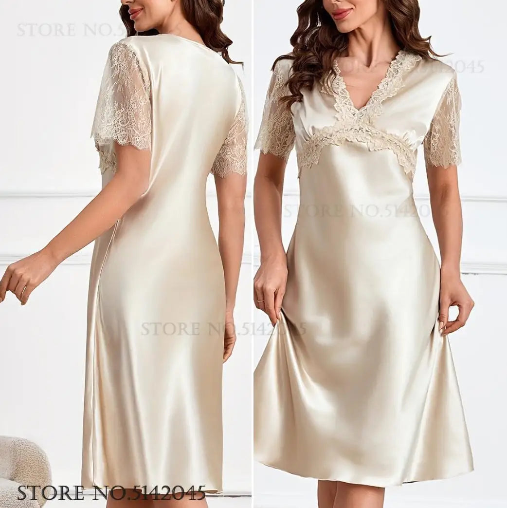 Women Nightgown Sleepwear Elegant V-Neck Lace Short Sleeve Nightdress Home Clothing Summer Silk Satin Nightwear Nightie Lingerie