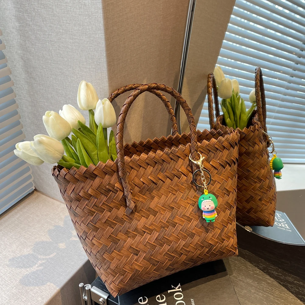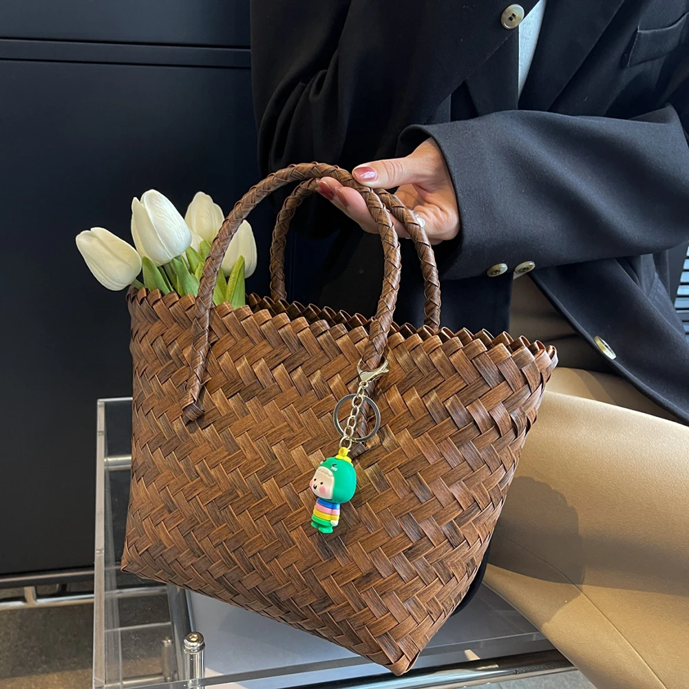 Women Weave Shopping Bag Fashion Summer Top-Handle Handbag Solid Color for Lady for Vacation Travel Daily Casual with Cute Pendant