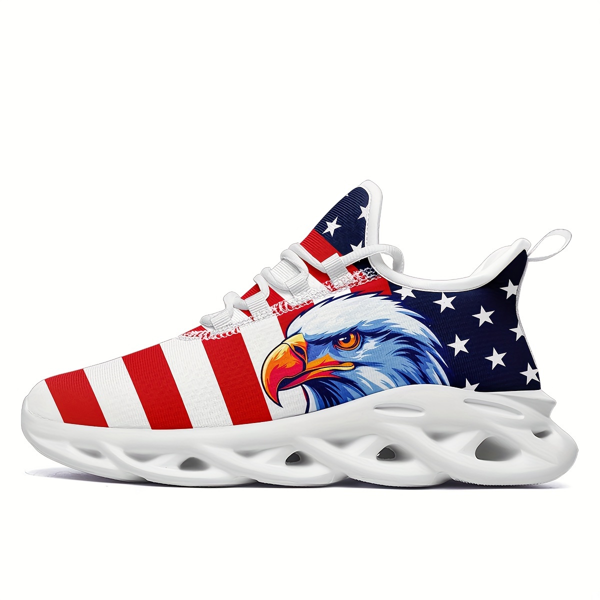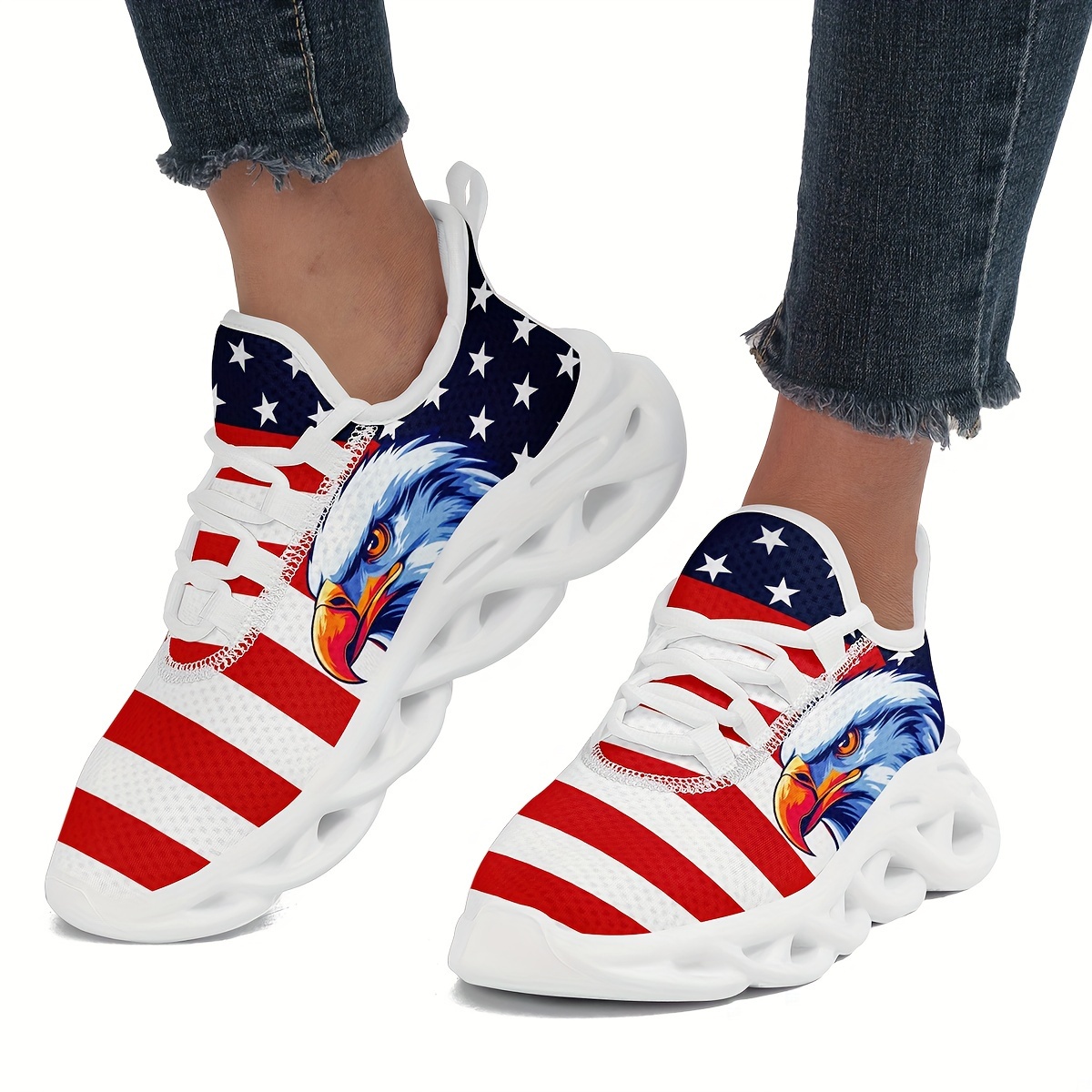 Women's American Flag & Eagle Patriotic Sneakers - Red White & Low-Top Sneakers with Arch, Cushioned Sole, All-Season Comfort - Ideal for Casual, Sports & 4th of July Events - Breathable Mesh & Lace-Up Closure - Lightweight