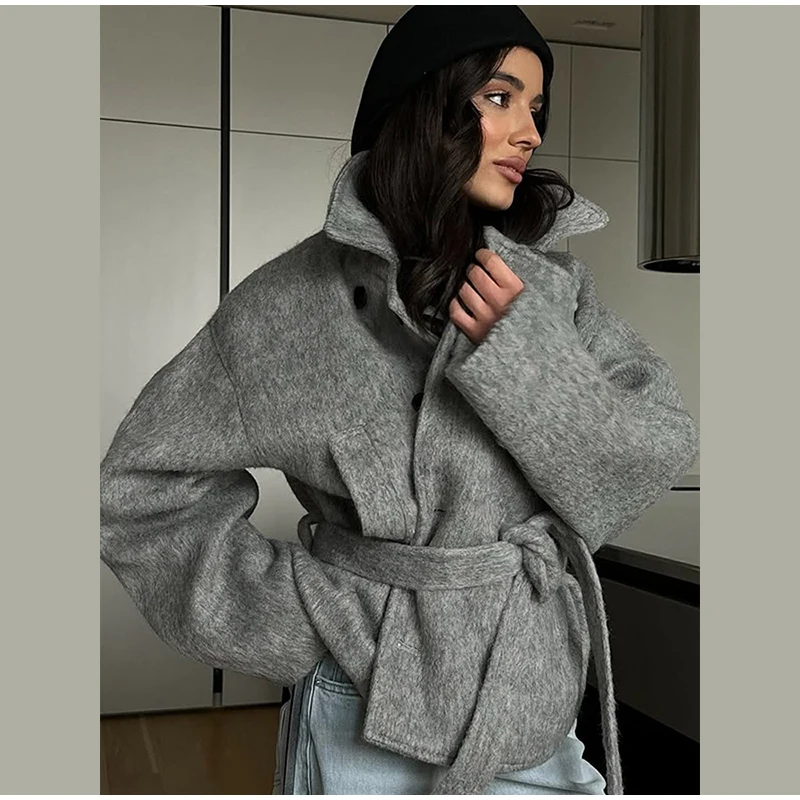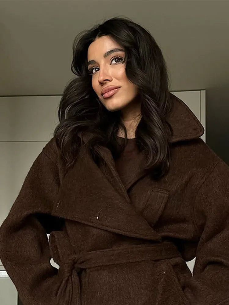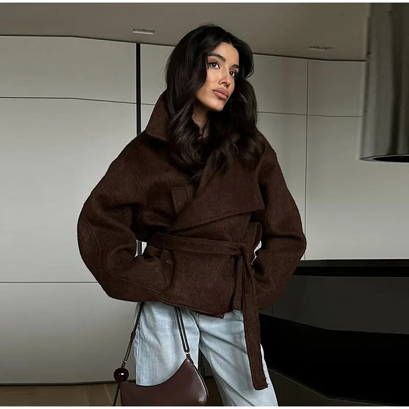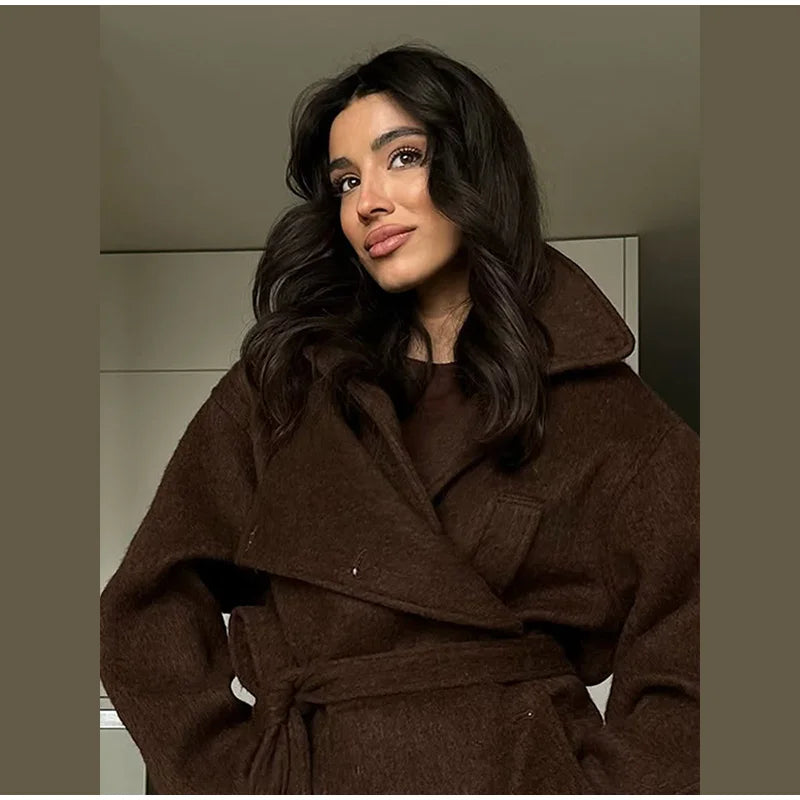 Women's Coat Elegant Laple Woolen Lace Up Belt Pocket Thicken Full Sleeve Female OverCoat 2025 Autumn Winter New Lady Outwears