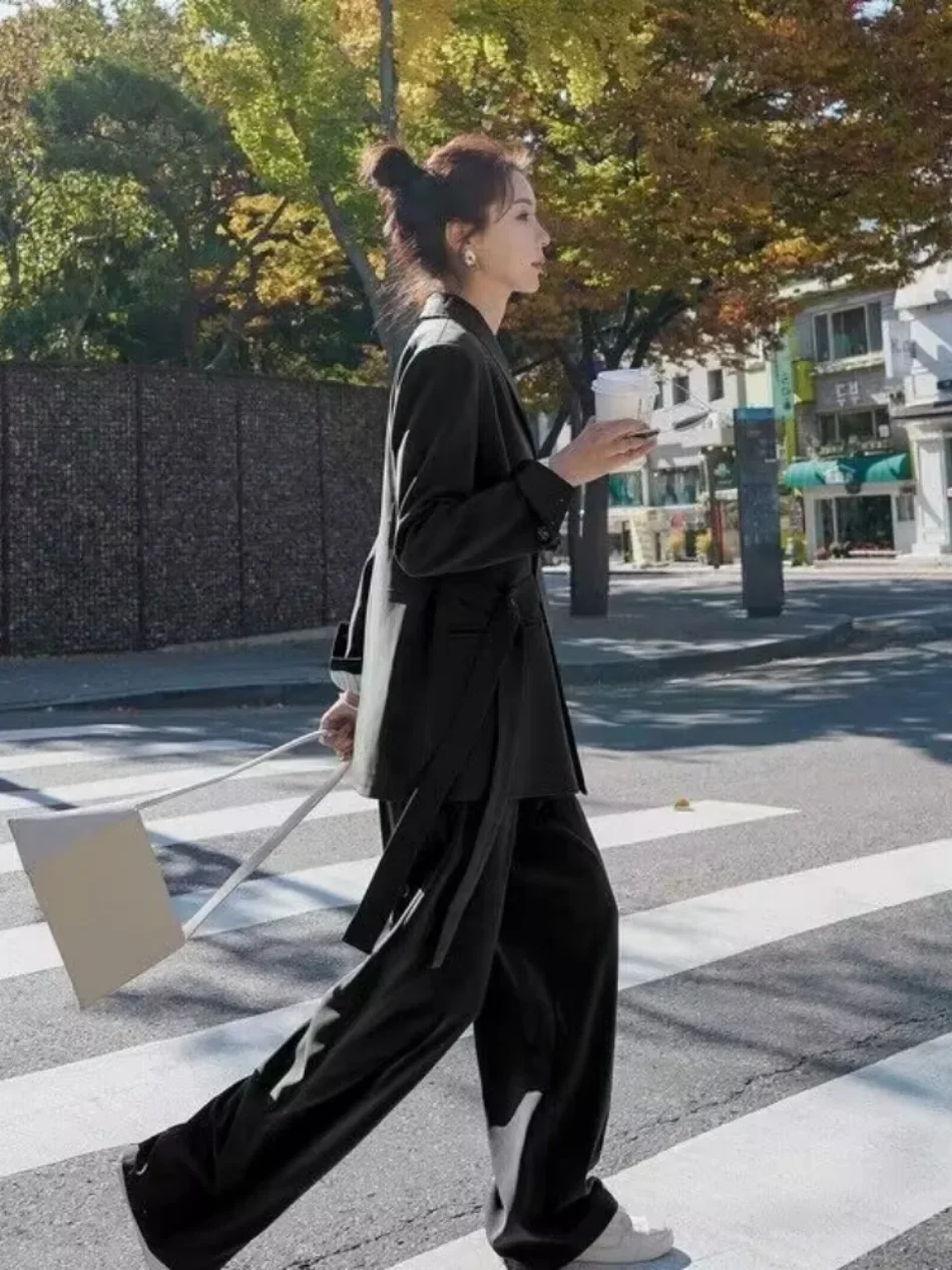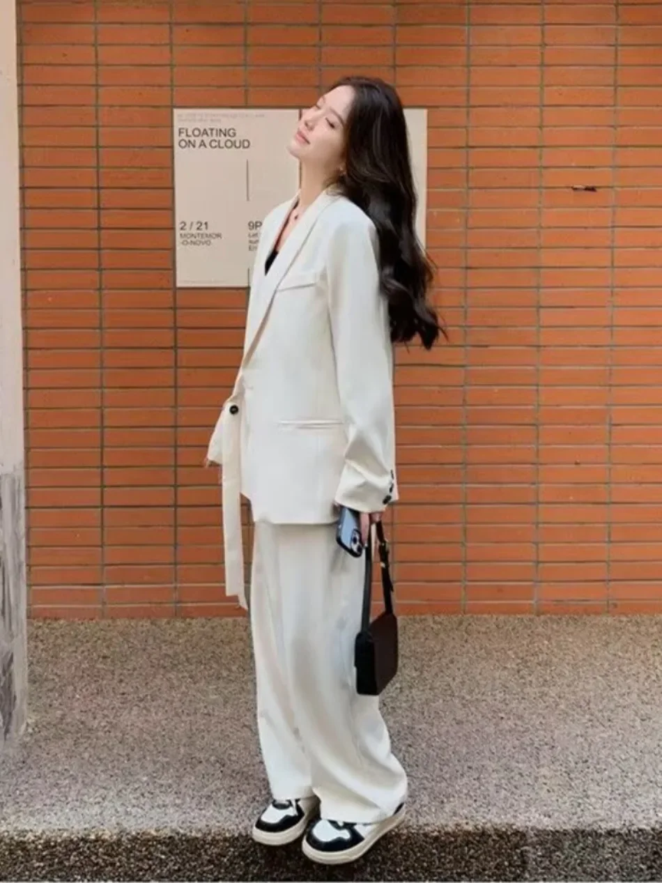 Women's Fashion Office Suit Set Casual Oversized Blazer And Wide Leg Pants Two-Piece Long Sleeve Top Bottoms Combo