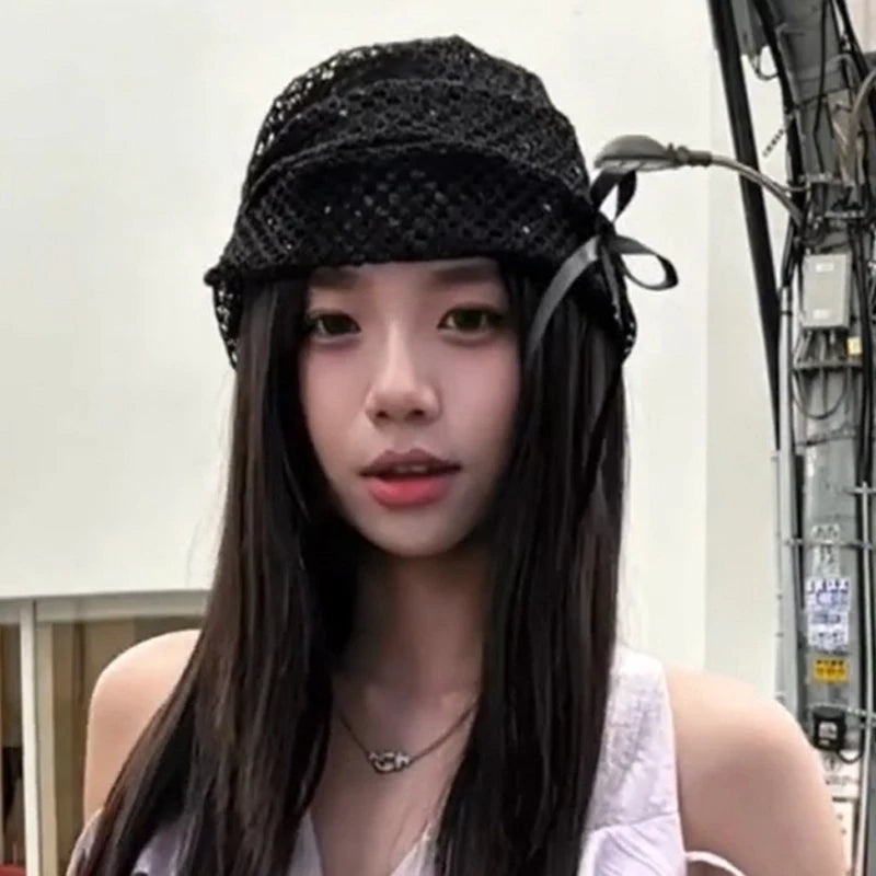 Women's Hat Hollow Bow Solid Color Simple Versatile Fashionable Personalized Pile Caps Elastic Sweet Elegant Lace Y2k Hats Girl