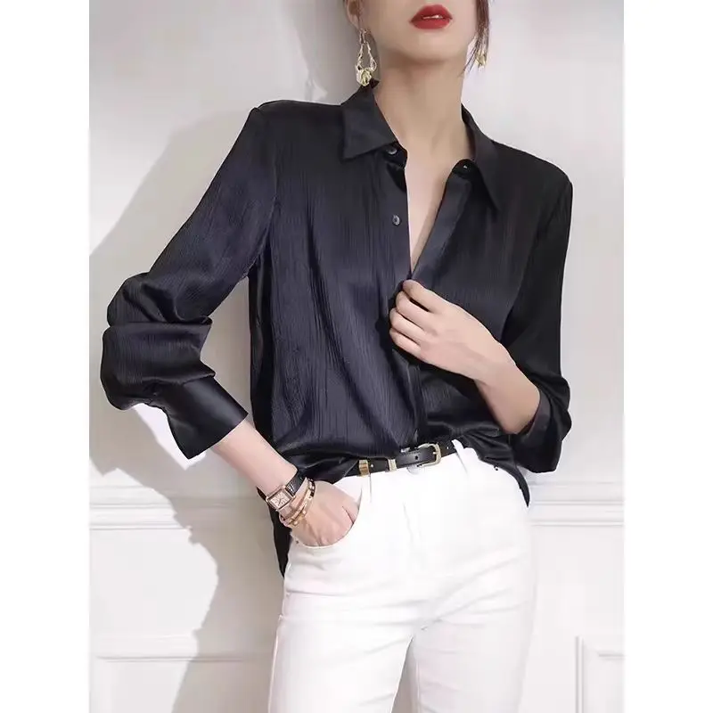 Women's Shirts Spring New Black Satin Texture Loose Long-sleeved Blouse Elegant Office Lady Work Wear Fashion Female Clothing